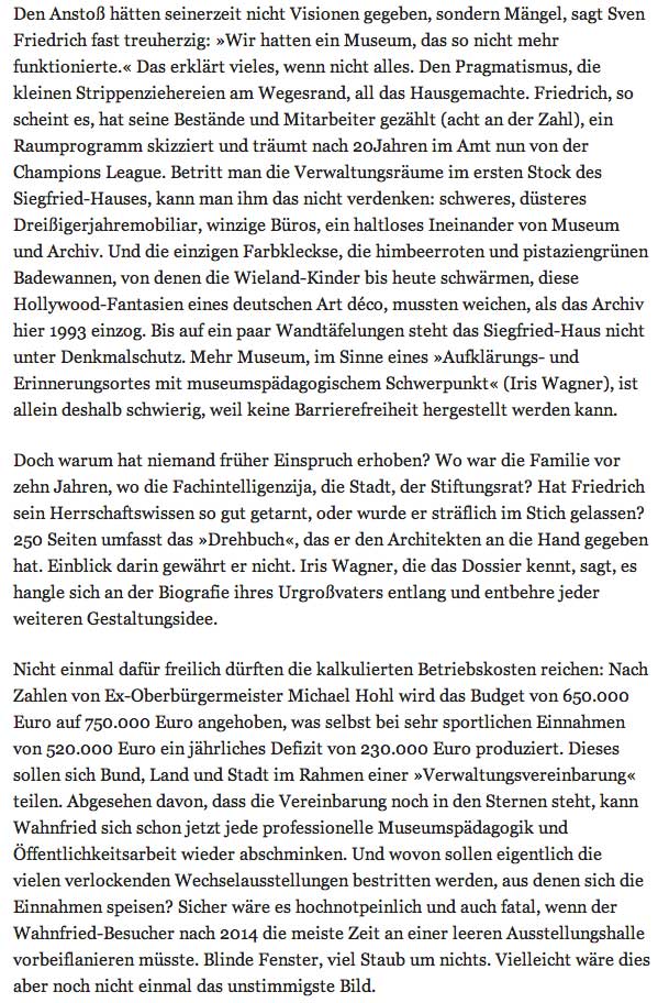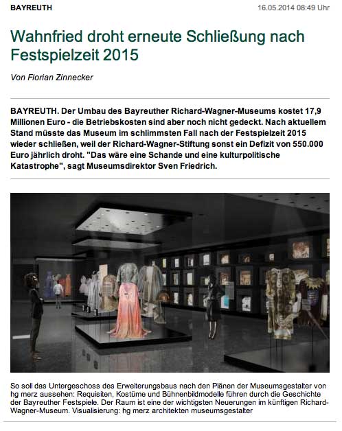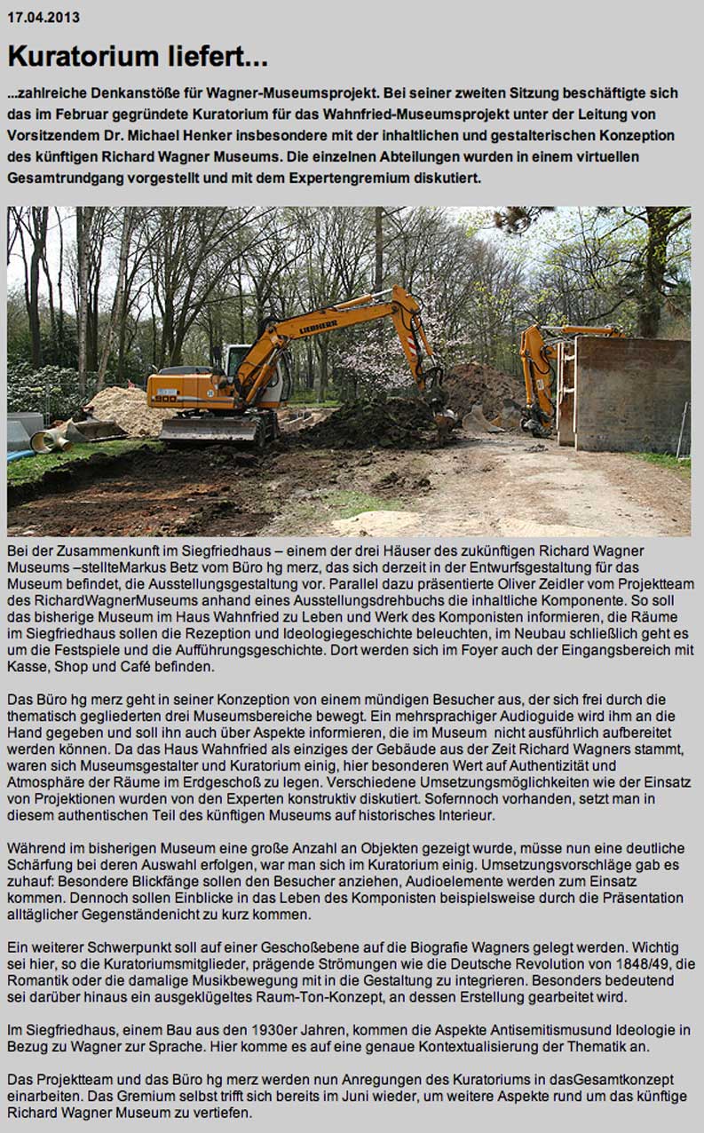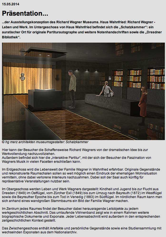 Die Gesamtkonzeption des neuen Richard Wagner (!) Museums (und somit auch der Siegfriedhauses) wurde über viele Jahre mit großem Aufwand entwickelt, wird von dem namhaften Museumsmacher hg merz gestaltet und muss und kann inhaltlich von uns verantwortet werden. Dabei können wir auf die Beratung eines namhaften Ausstellungs-Kuratoriums bauen und vertrauen, dem Dr. Michael Henker, Präsident ICOM-Deutschland, Prof. Dr. Hermann Schäfer, vorm. Direktor des Hauses der deutschen Geschichte, Bonn, Prof. Christoph Stölzl, Dr. Klaus Weschenfelder, Dr. Jörg Skriebeleit, KZ-Gedenkstätte Flossenbürg, Prof. Dr. Stephan Mösch und Dr. Markus Kiesel angehören, mit denen die Gestaltung sowohl inhaltlich und formal abgestimmt ist.