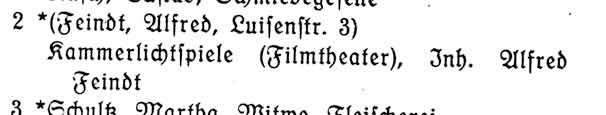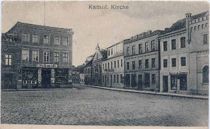 eine Gruss-Karte von Ella Gremmels aus Edwins Haus am Nord-Ufer des Markts mit der Ansicht von der südlich gelegenen Kath. Kirche, die dann Kino wurde als Kammerlichtspiele von A. Feindt aus der Luisenstrasse.