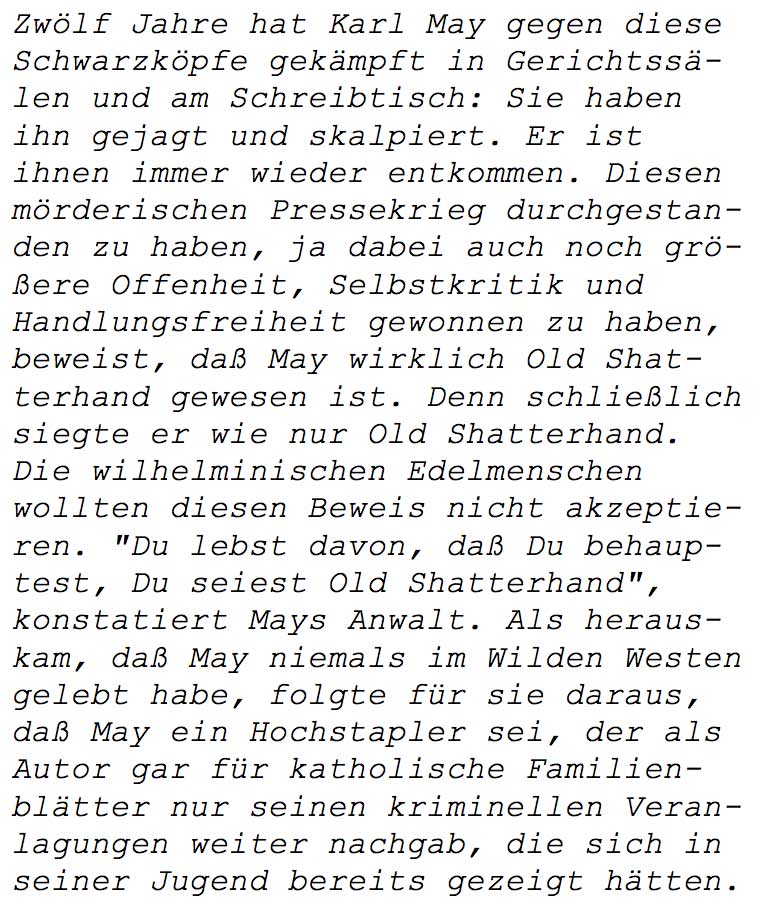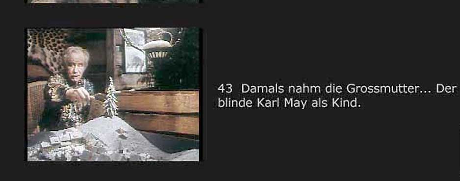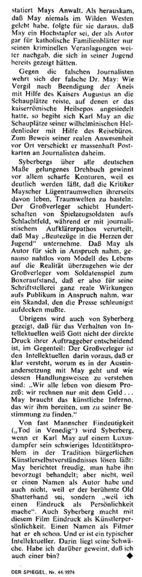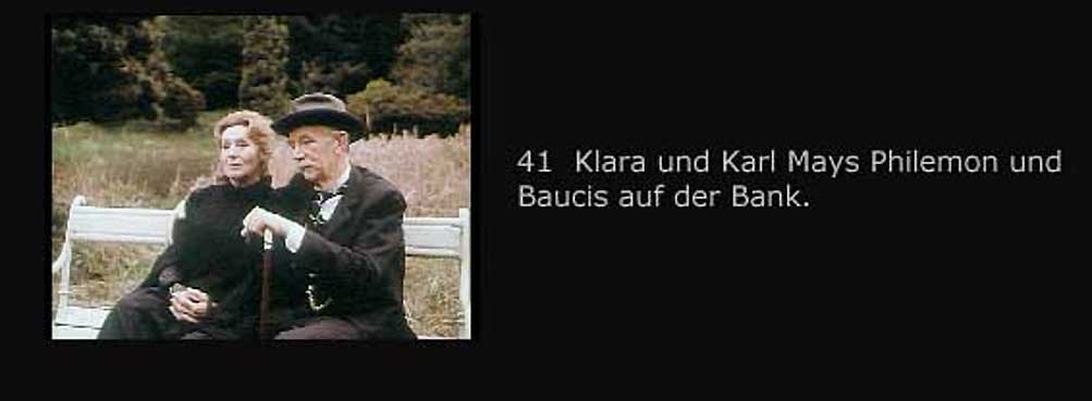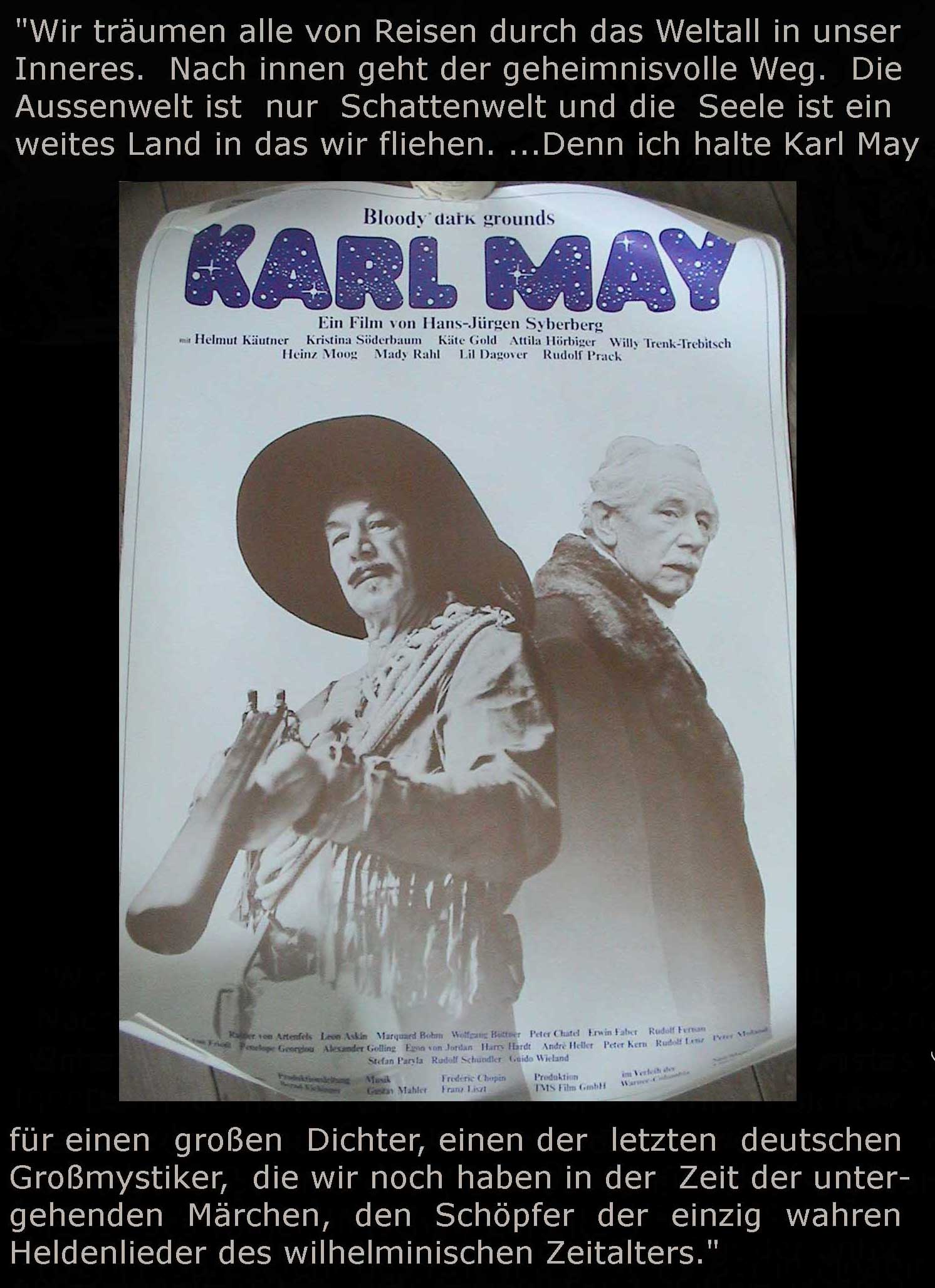 Verknappt, doch biographisch exakt und meist mit authentischen Texten inszeniert Syberberg das Trauerspiel der letzten zwölf Lebensjahre Karl Mays -- der endlosen Haupt- und Nebenprozesse, der Pamphlete gegen den "geborenen Verbrecher" und der Gegen-Pamphlete, der Alterswerke, der Scheidung von Emma, jener "perversen Dämonin", des Philemon-und-Baucis-Glücks mit der zweiten Ehefrau Klara.