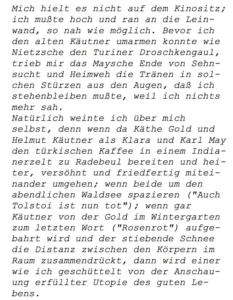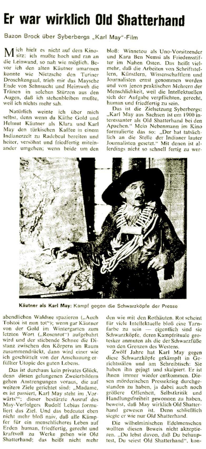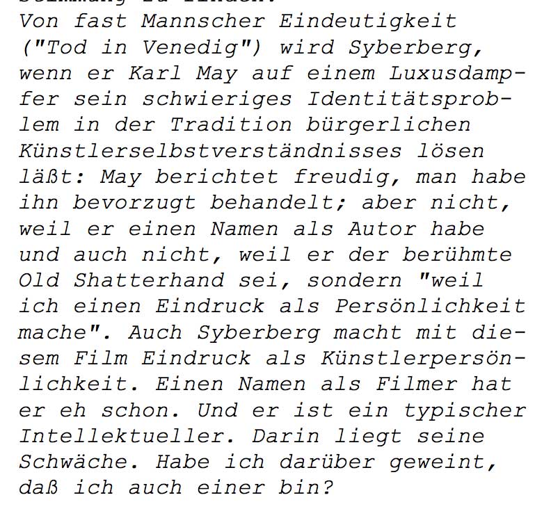 Und das tat er auch, mochte es Syberberg nun passen oder nicht. Weich, verträumt, zwielichtig wandelt er vorüber an all den statuarischen Gesichtern ein tragischer Karl May, der dem deutschen Volk noch manche Träne entlocken wird.