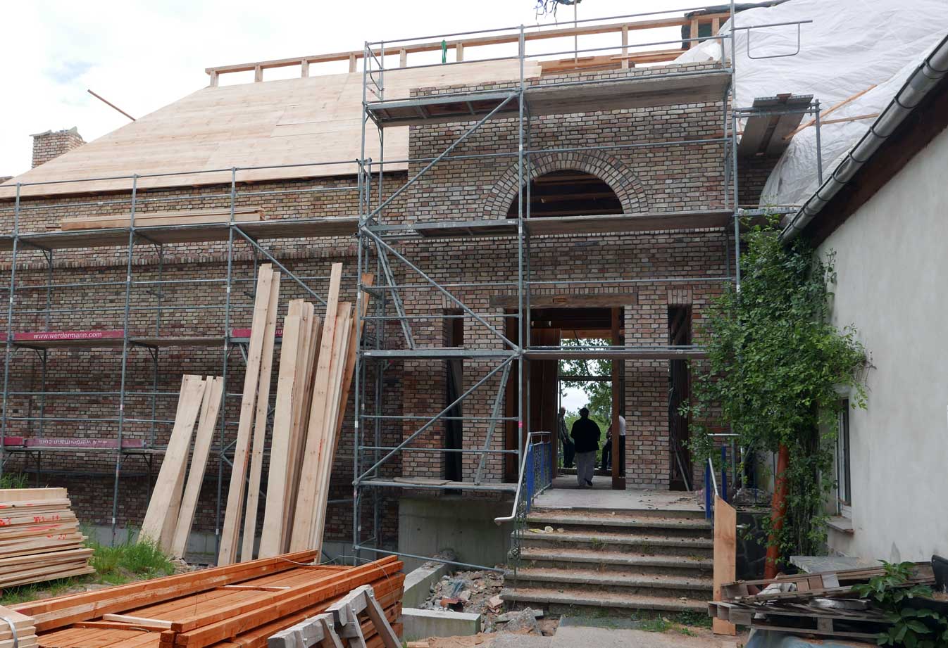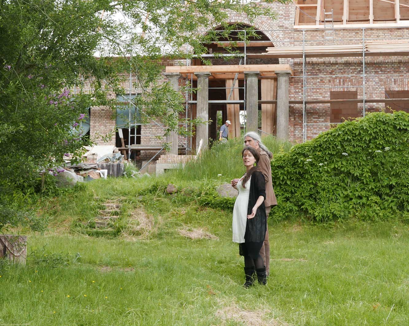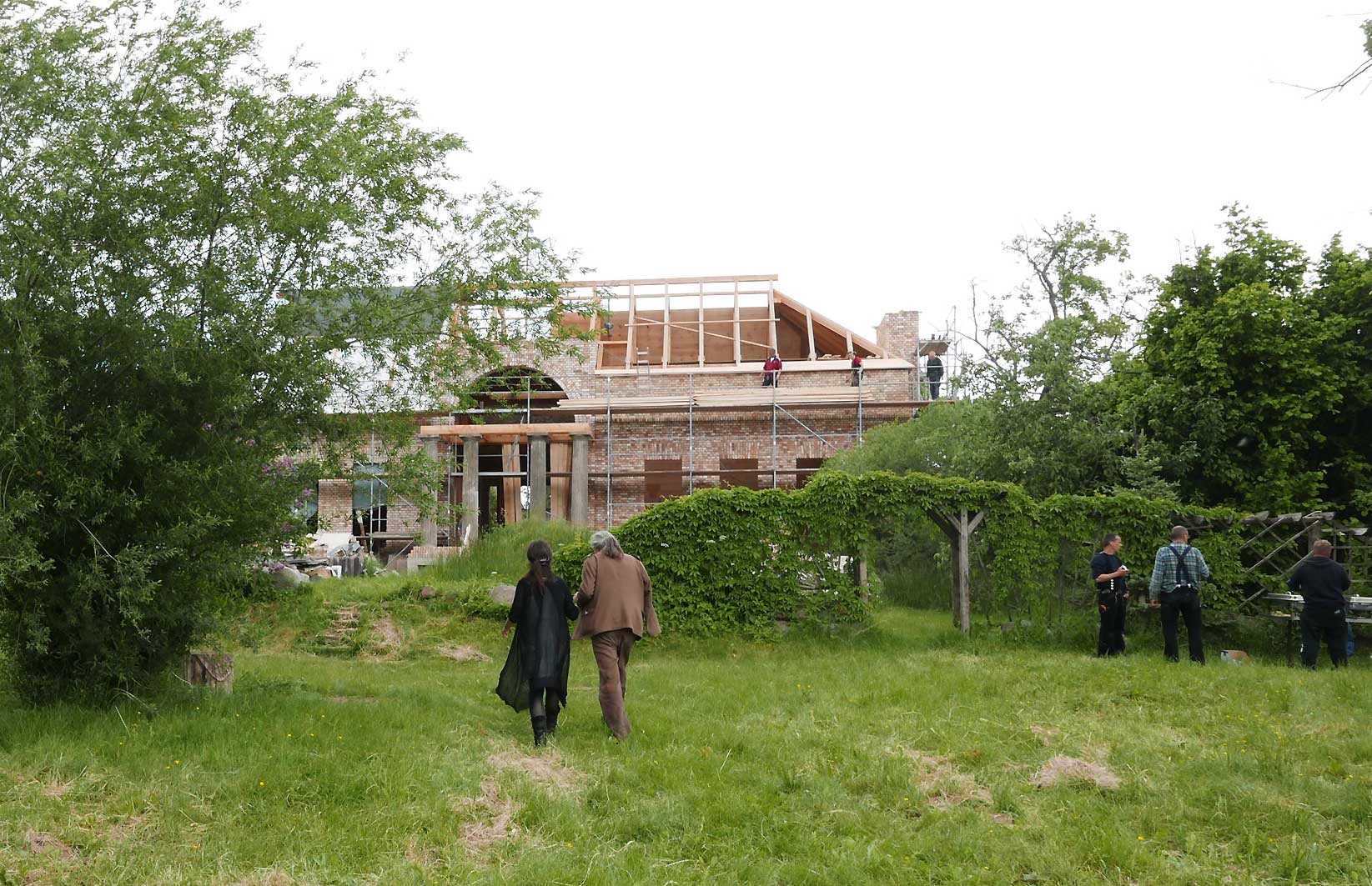 Architekten Alexander Schwarz und Freunde im Team Chipperfield Berlin Museumsinsel usw. jetzt hier mit dem Fest des Baus zum Geburtstag der Frau. mit den Bauleuten und den Leuten aus dem Dorf. Ans alte Haus angelehnt das Neue.