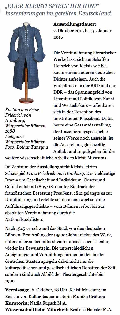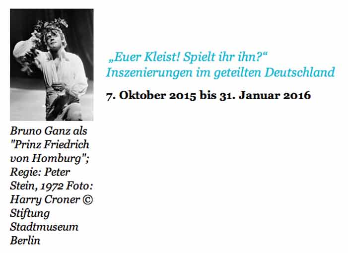 In Frankfurt an der Oder gibt es ein Kleist gewidmetes Museum. Zu letzt mit neuem Anbau und Unterstütztung aus Berlin hochbewertet. Nun wird eine Ausstellung zum Thema Prinz von Homburg in Ost-und Westdeutschland angekündigt, mit Teilnahme der Kulturstaatsministerin Grütters aus Berlin. Im Text dazu wird ein wisssenschaftlicher Aspekt und eine Gesamtdarstellung angekündigt und auf früheren Missbrauch durch Interessen in Ost und West und ingesamt hingewiesen. Dazu sehen wir in der Ankündigung gleich die richtungsgebende Linie mit Beispielen aus der Schaubühne(Bruno Ganz als Homburg von 1972 und Theater Heute mit dem Titelbild dazu). Damit wir die Bühnengeschichte dies Homurg falsch fixiert.