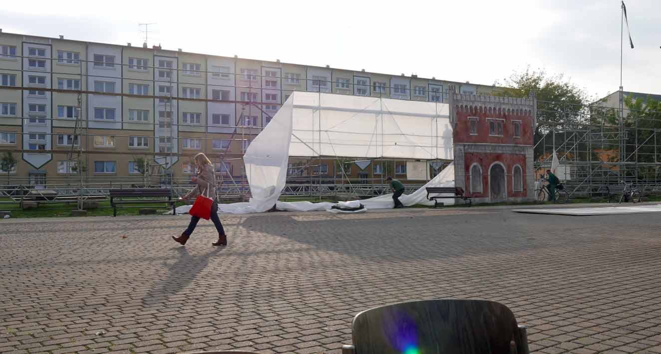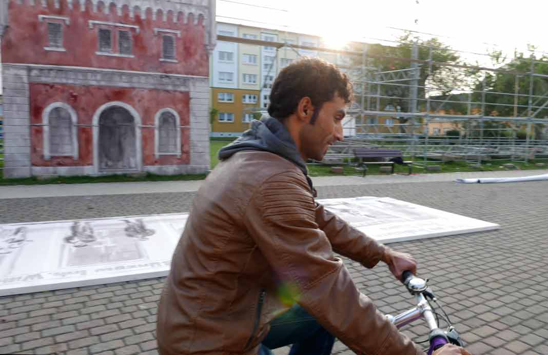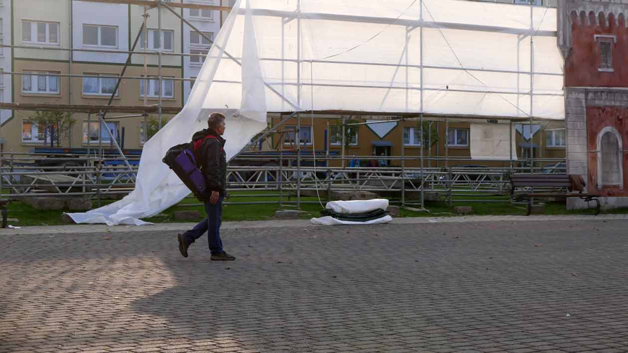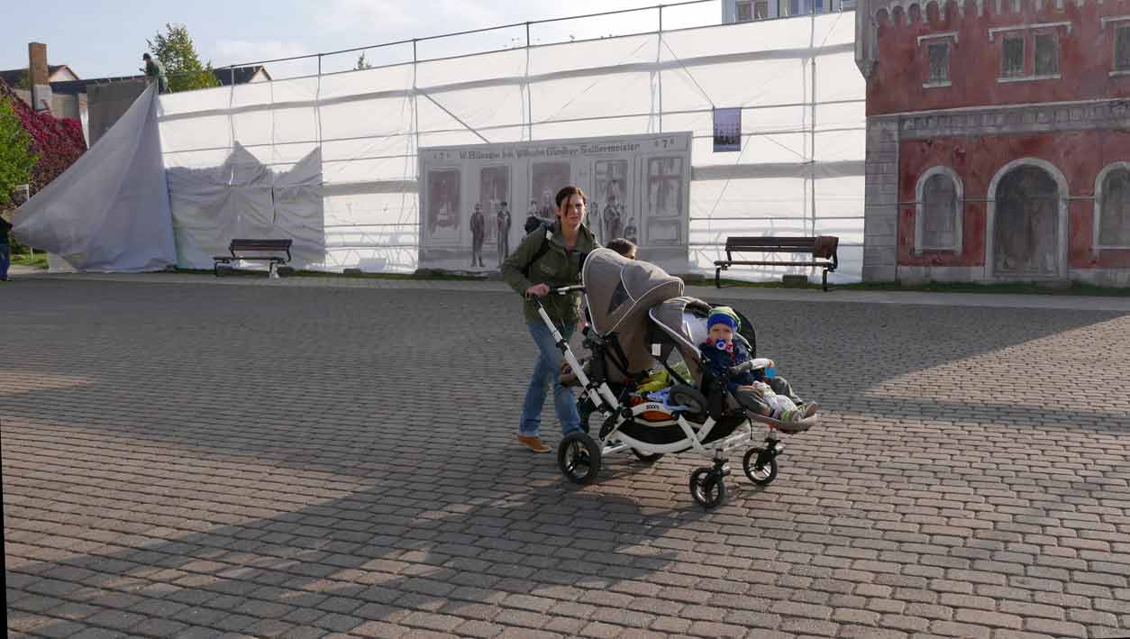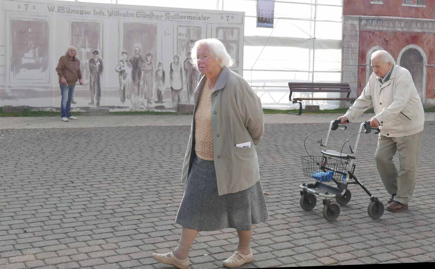 aufnehmen, festhalten wer da geht, über dem Platz, vom einem Platz auf dem Platz, noch vor einer Kulisse, die wir dem Platz geboten.