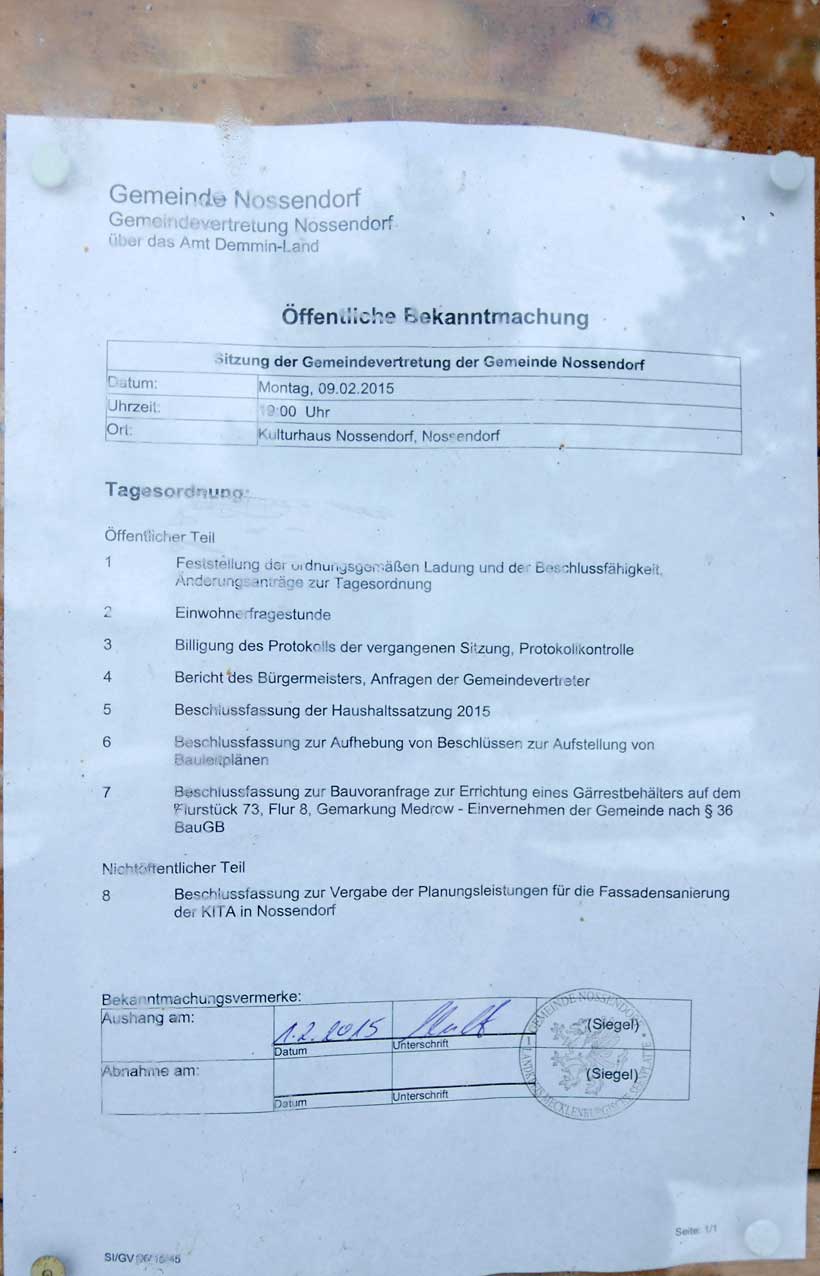 Und was gedenkt die Gemeinde Nossendorf an Sachen Asylanten zu tun. Um die Kassen zu ordnen, um sich menschlich zu positionieren und politisch nicht in Abseits zu kommen. Fragen nach leerstehenden Kapazitäten, Verpflichtungen öffentlicher Subventionen sind zu beantworen. Eine Initiative der Bürger wäre organisierbar, eine Versammlung der Bewohner wäre ein Schritt, ohne einschüchterne Lenkung der öffentlichen Organe.