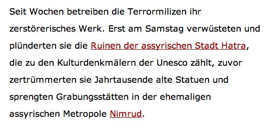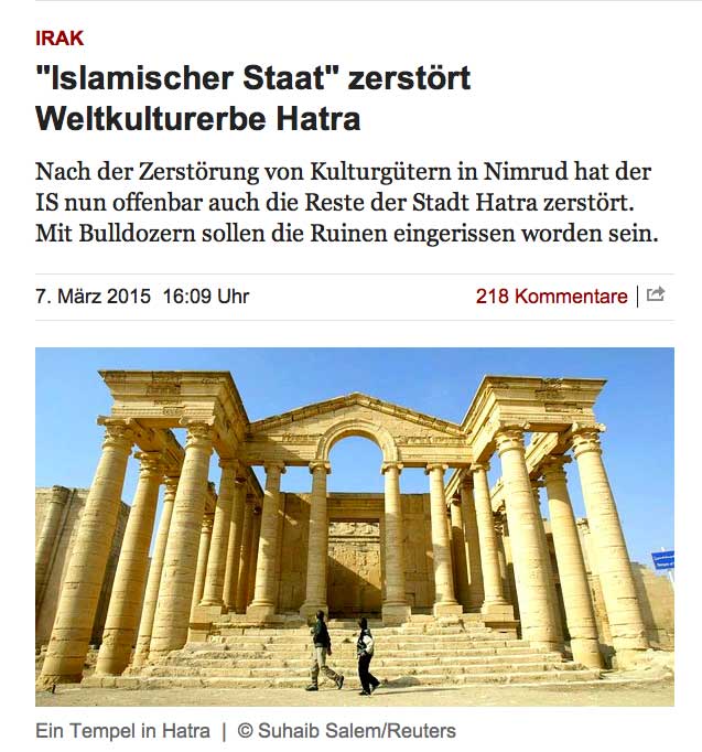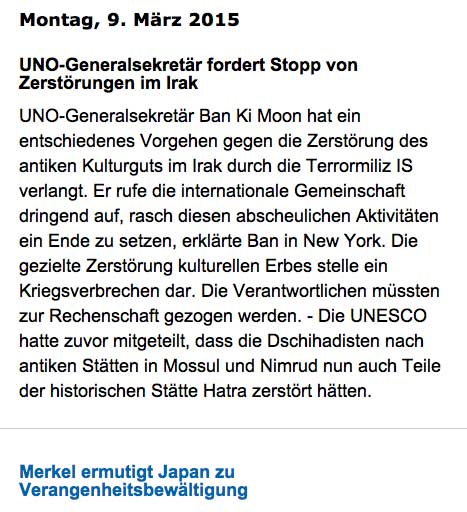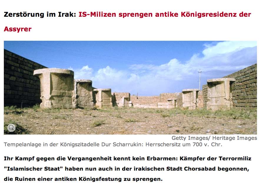 1. März 2015 ... Die Kulturzerstörungen des IS werden breitgewalzt, aber die während ... Eine der ersten Handlungen der Amerikaner in Bagdad war übrigens ..."