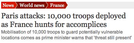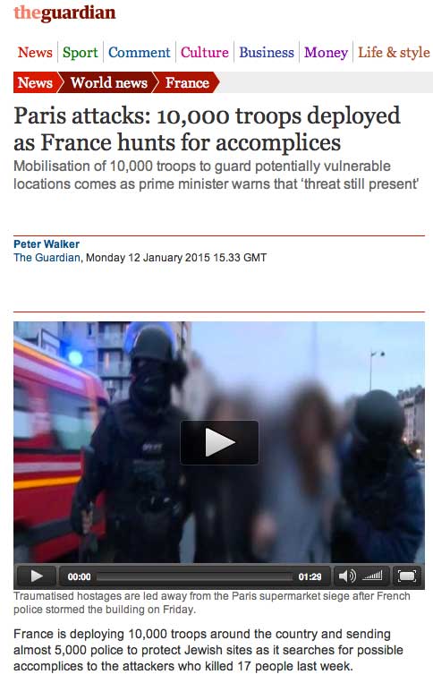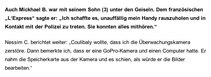 in einer Nebenstrasse aufgenommen das Gehen- spielen an der Spitze des Volkes von Paris -mit bitte halt und noch mal und Weitergehen noch mal, Anweiungen der Regie- und das dann in die 3 Stunden-Übertragung der demnostrierenden Menschen auf den Strassen und Pläzen hineingeschnitten als gigantische Medien-Inszenierung eines Marsches der Trauer durch Paris. §KM lang.