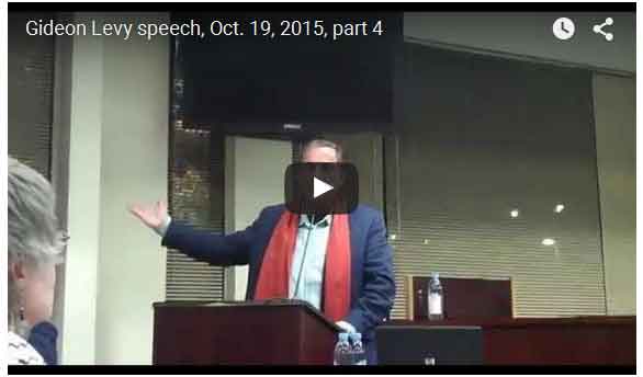Letzte Nacht gab der Ha'aretz Kolumnist Gideon Levy einen spannenden Abend, eine Beschreibung der brutalen Tyrannei der Okkupation, von der Unvermeidlichkeit der Ein-Staaten-Lösung, und von der Notwendigkeit des Boykott und der Sanktionen, um zu bewirken dass Israel, sein Verhalten ändert (im Greenburgh Rathaus Westchester County, NY). Levy war Gast ger Jüdische Stimme für Frieden und Wespac. Suhail Khalilieh des Applied Research Institute von Jerusalem aus den Siedlungen sprach auch; Ich werde, seine Rede in den nächsten Tagen bekommen, oder so zu