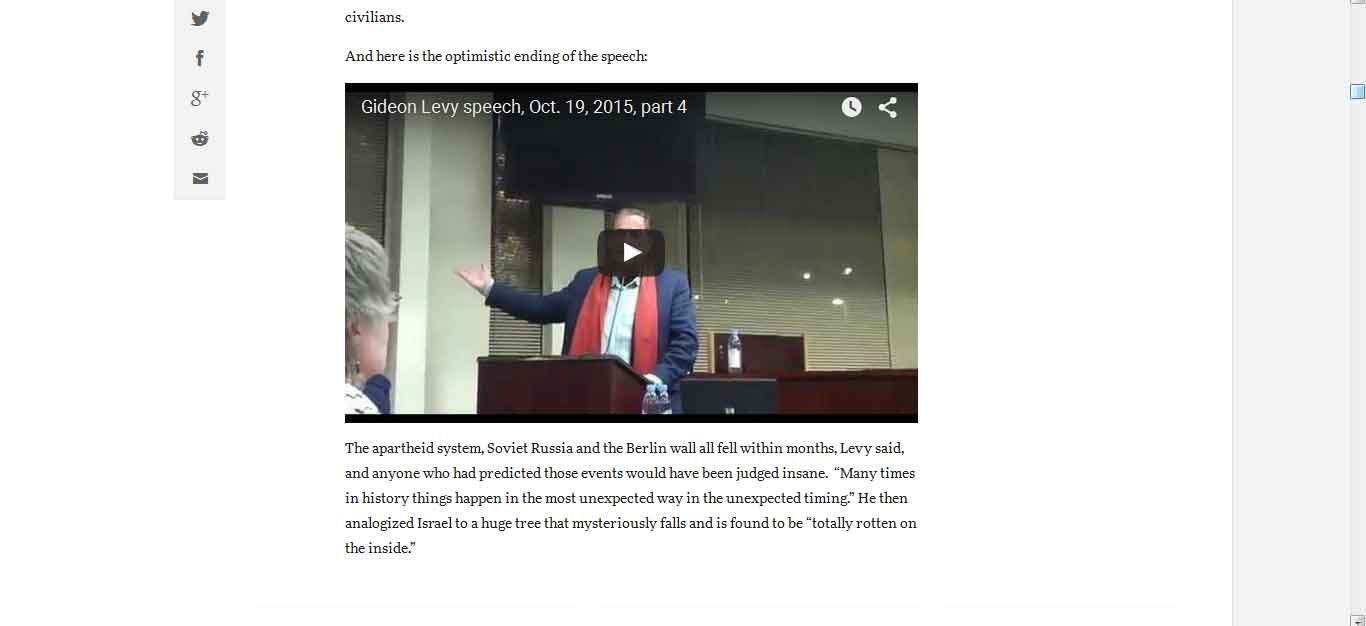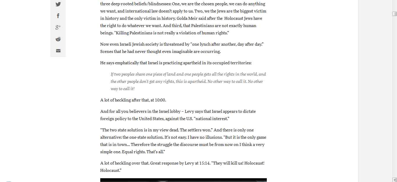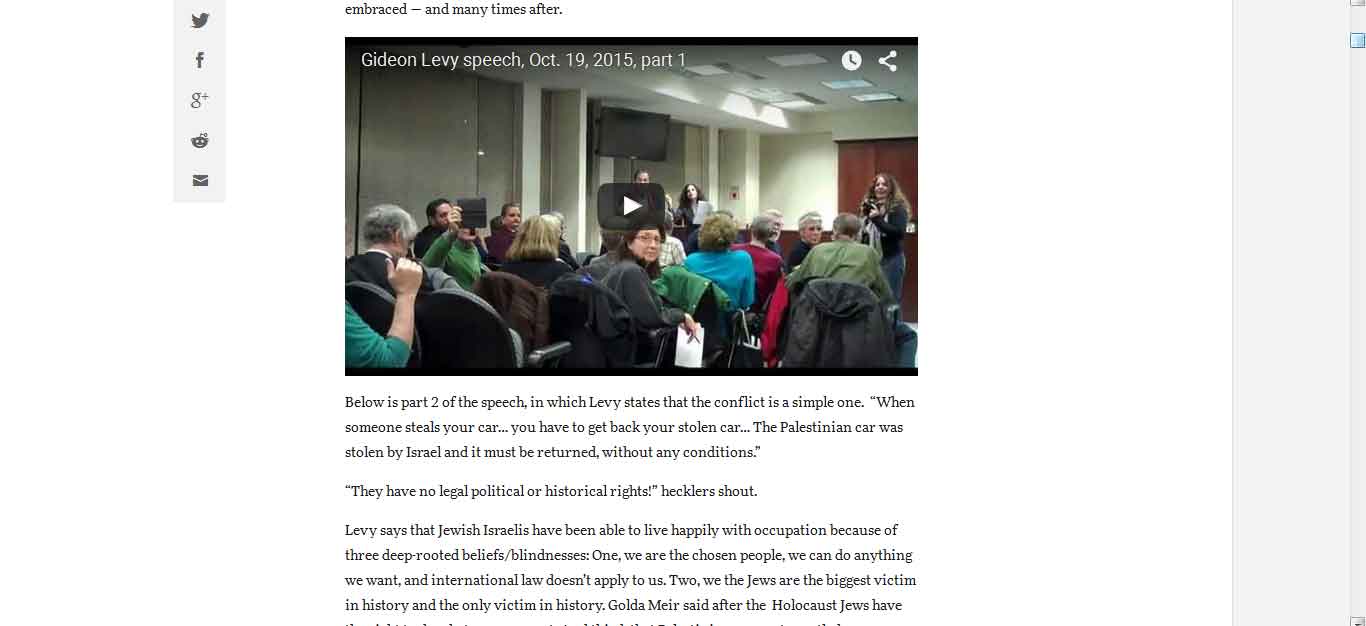 Unten ist Teil 2 der Rede, in der Levy sagt , dass der Konflikt ein einfacher ist. "Wenn jemand Ihr Auto stiehlt ... haben nur eines im Sinn, ihr gestohlenes Auto wieder zu kriegen... Das palästinensische Auto wurde von Israel gestohlen und es muss zurückgeschickt werden, ohne jegliche Bedingungen."
