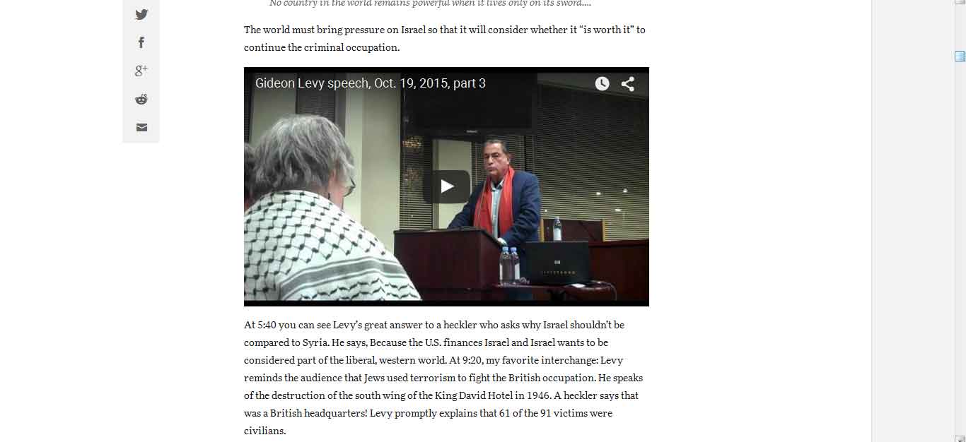 Um 5:40 Sie Levys große Antwort auf einen Zwischenrufer, der fragt, warum Israel nicht mit Syrien verglichen werden sollte. Er sagt, weil die USA Israel finanziert und Israel ein Teil der liberalen, westlichen Welt sein will. 9:20, mein Lieblings-Teil: Levy erinnert das Publikum, dass die Juden (selbst)Terrorismus anwendeten, um die britische Besatzung bekämpfen. Er spricht von der Vernichtung der Südflügel des King David Hotel im Jahr 1946. Ein Zwischenrufer sagt, dass war eine britische Hauptquartier! Levy u erklärt, dass 61 der 91 Opfer Zivilistenwaren.