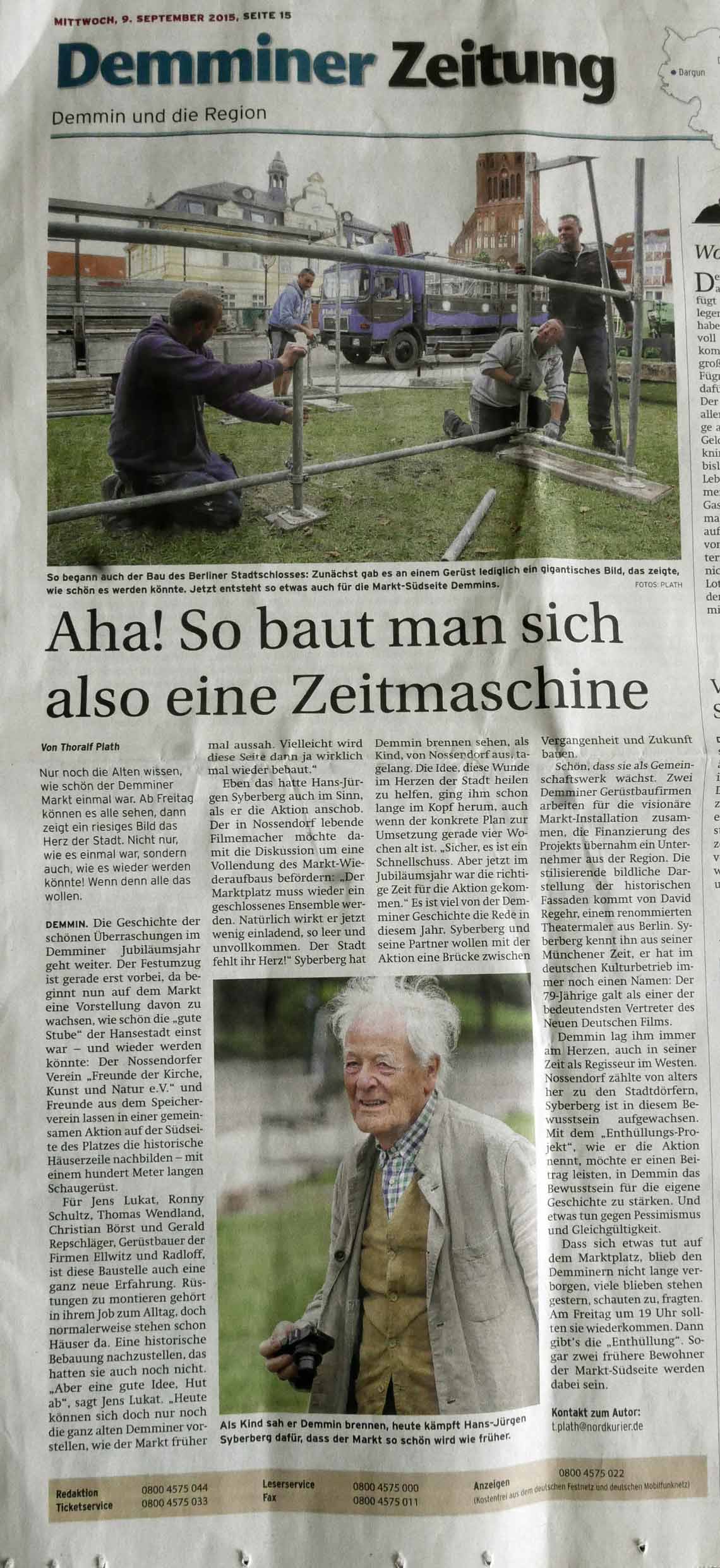 Initiiert wurde der Versuch von den Freunde der Kirche/Natur und Kunst im Nossendorf. Begleitet von dem Nordkurier sorgfältig und engagiert, obwohl noch nicht verstanden, wie der Film von der Erde mit allem zusammenhängt und warum soetwas zum berichteten Leben einer Stadt dringend und nachzudenken dazugehört, wenn sie überleben will. Der berliner Anteil ist auch nicht zu übersehen, sonst hätte da nichts gestanden ausser ein Gerüst und guter Wille. Alles zusammen eine runde Sache mit Plänen in die nächste Runde. Besucher der Stadt kamen, wie sonst wohl lange nicht.