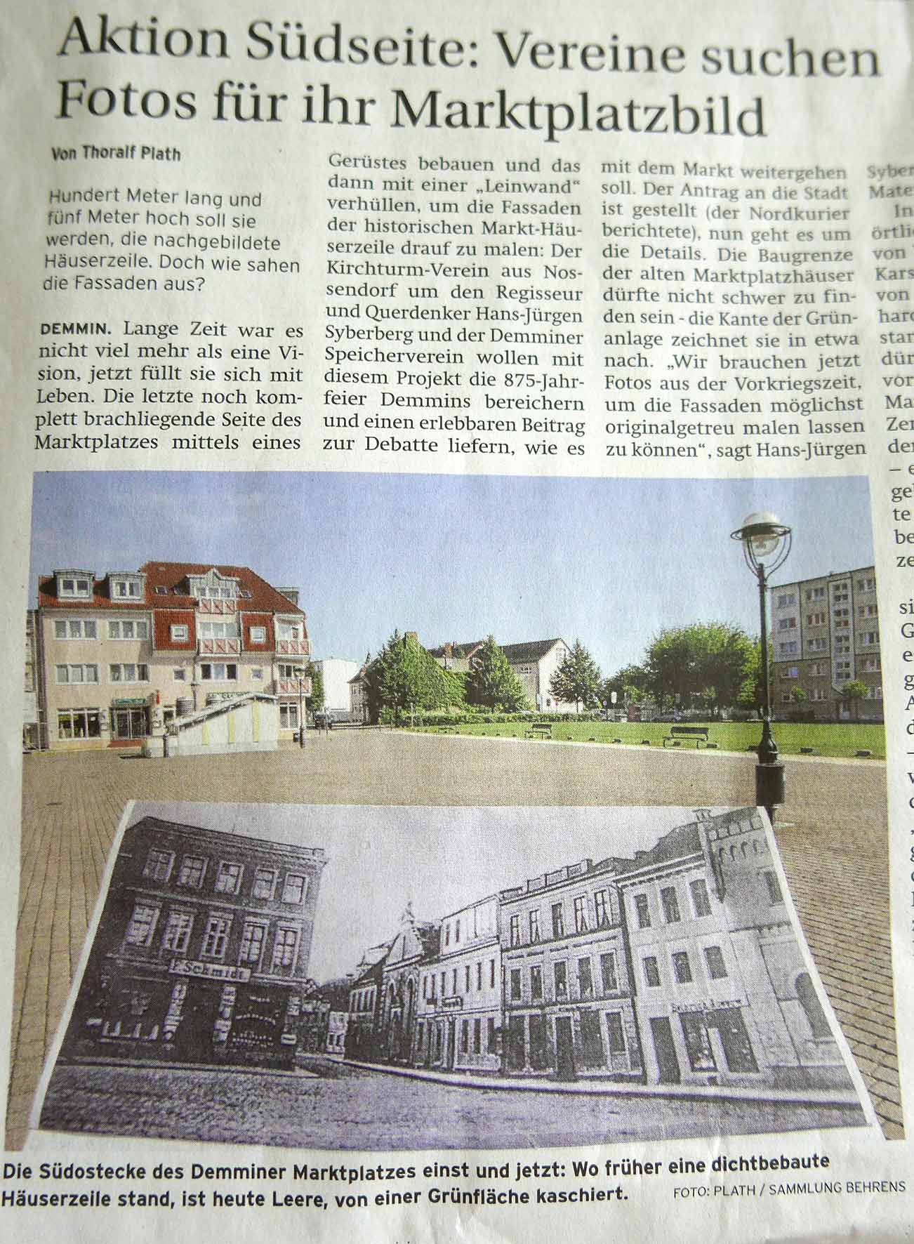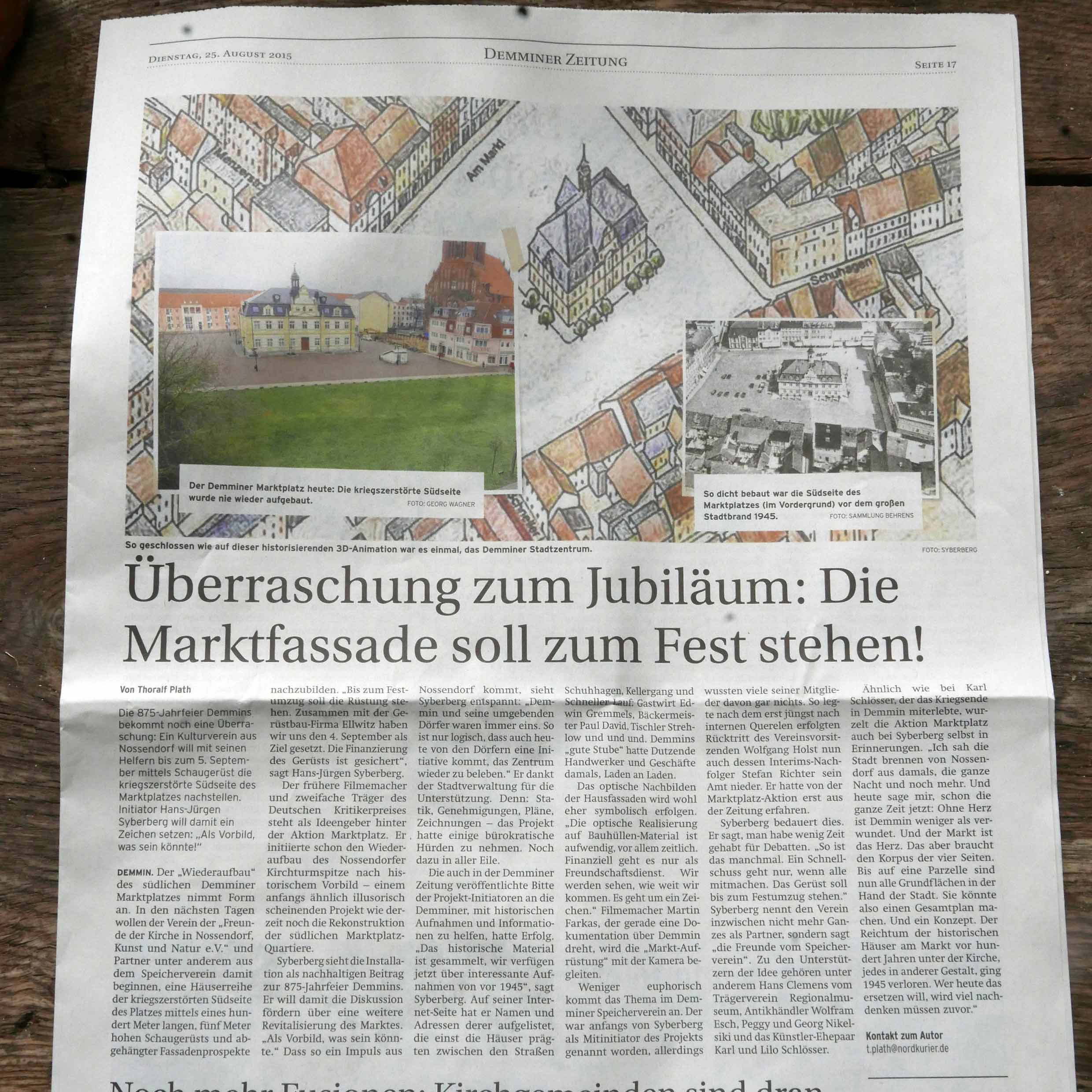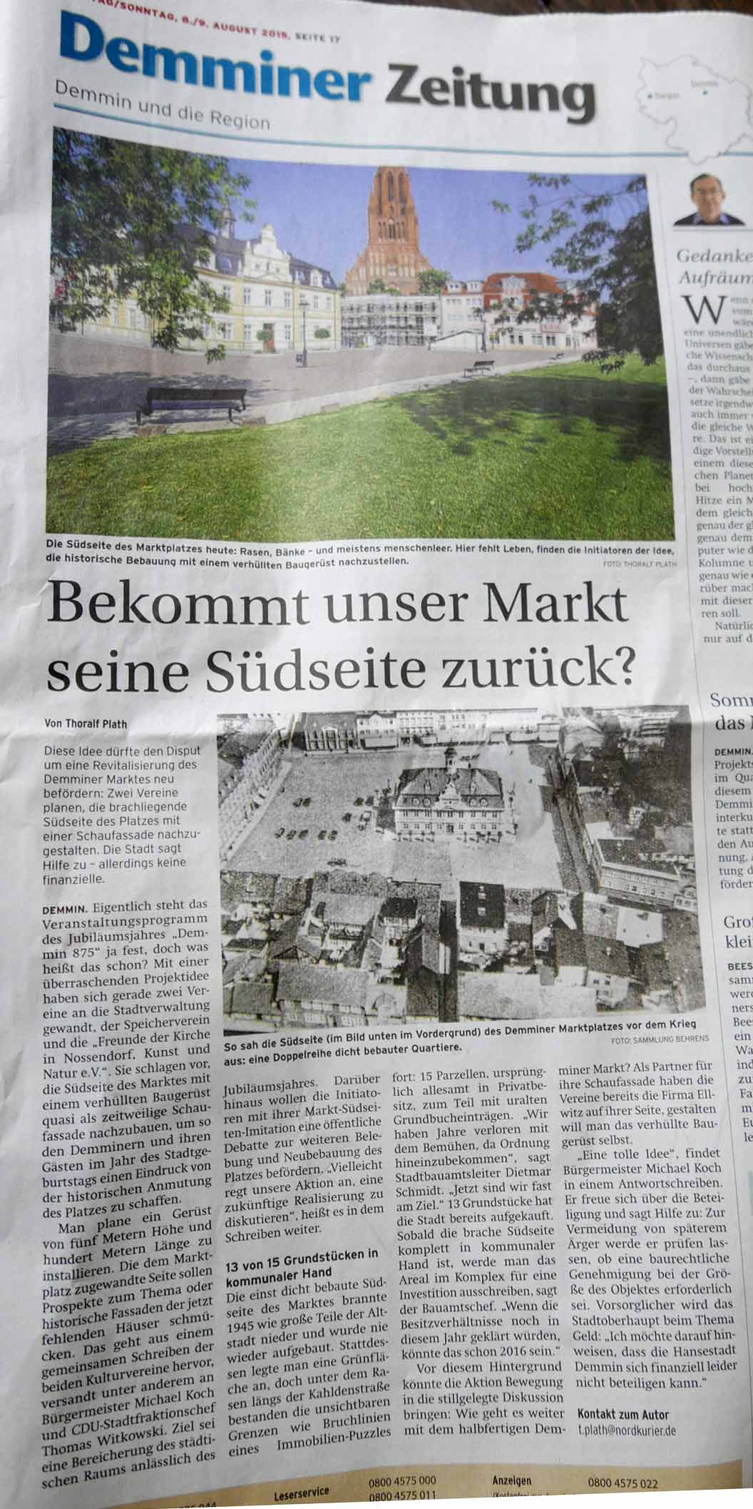 Nun ist sie fertig, die zusammenfassende Sammelseite zur Markt-Installtion in Demmin im letzten Jahr. In 6 Wochen stand alles. Für 3 Wochen, die Demminer zu erinnern, was da mal war und was sie waren, in Teilen und als Raum, in ihrem Zentrum. Wir hatten die Chance auf noch leerem Platz zu sein. Die Mittel kamen von den Menschen die da leben, und alle Ämter haben freundlich geholfen. Zur 875 Jahrfeier der Stadt eine seltsame Aktion 70 Jahre nach der Zerstörung. Entstanden als Gegengabe für eine Einladung zum Geburtstag den Film zu zeigen mit dem Titel: Wieviel Erde braucht der Mensch. Nämlich nicht nur das Mass seines Grabes am Ende des Weges und Ganges oder Rennens im Leben, sondern auch auch soviel, um darauf sein Zeichen zu setzen.