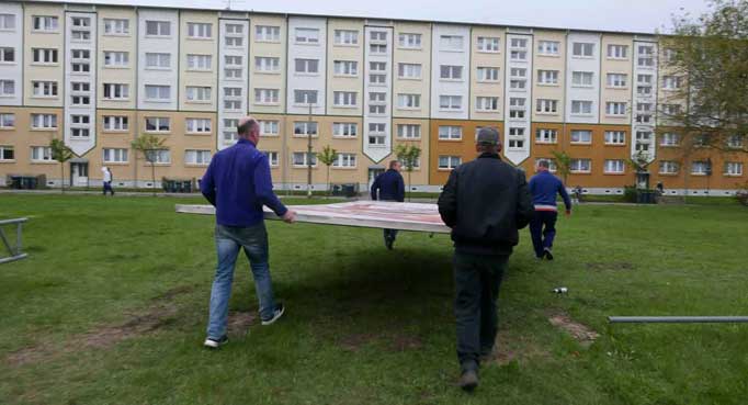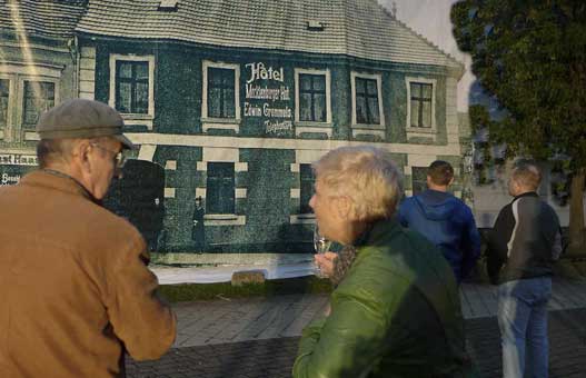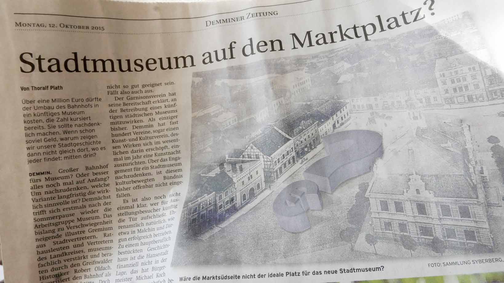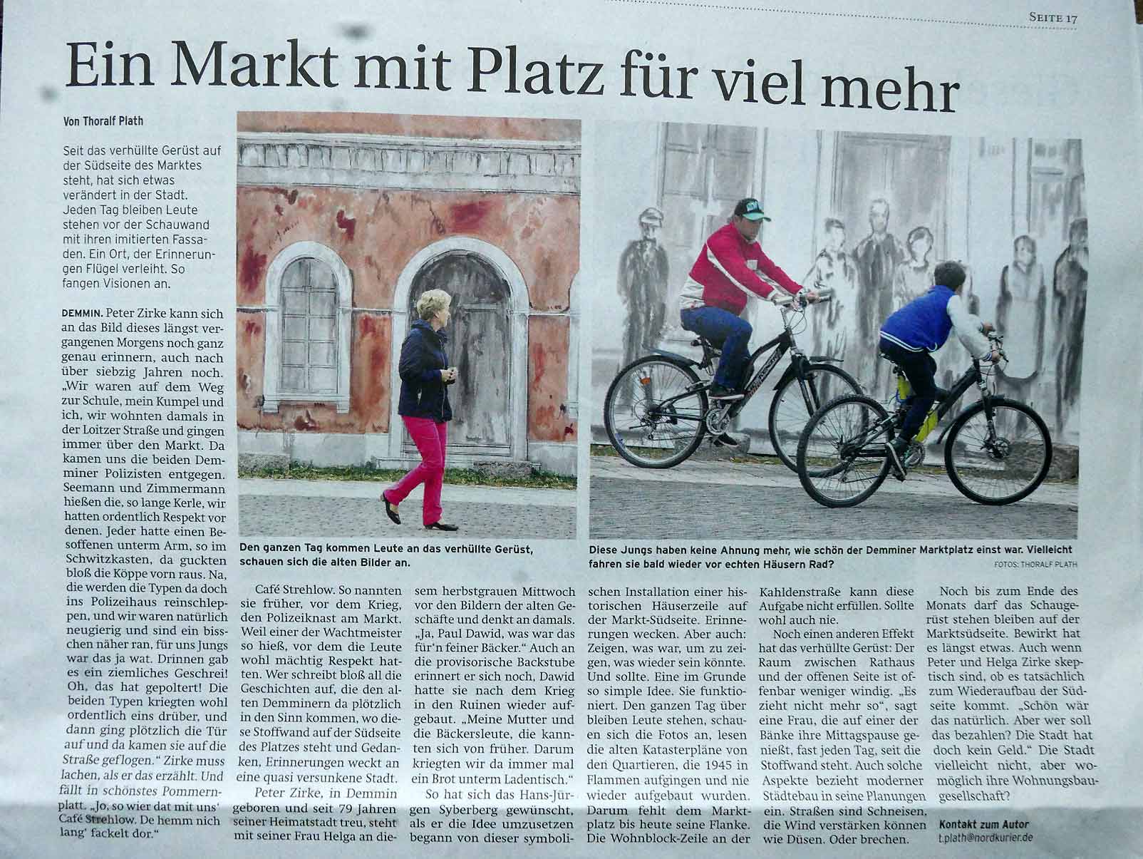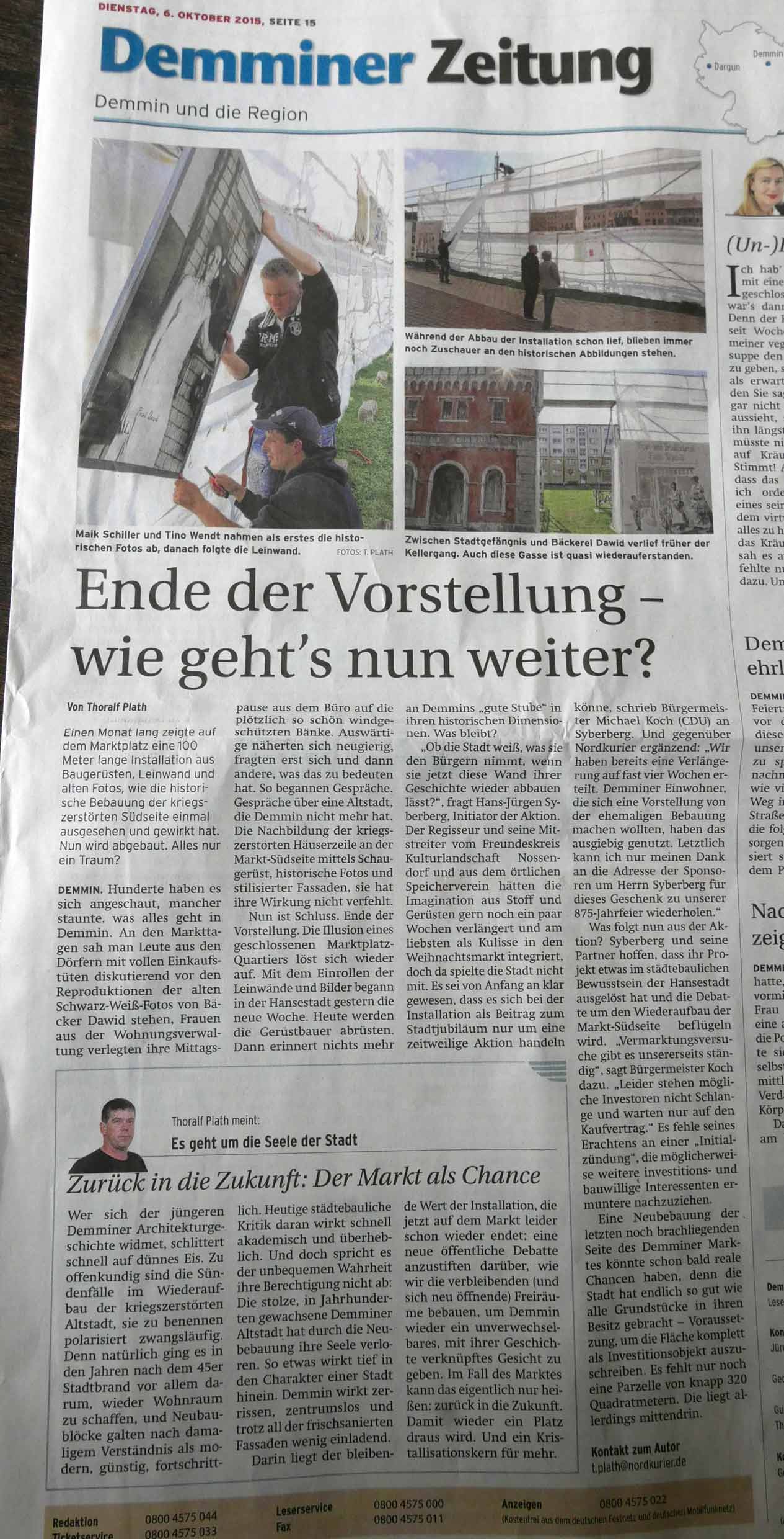 Nun ist sie fertig, die zusammenfassende Sammelseite zur Markt-Installtion in Demmin im letzten Jahr. In 6 Wochen stand alles. Für 3 Wochen, die Demminer zu erinnern, was da mal war und was sie waren, in Teilen und als Raum, in ihrem Zentrum. Wir hatten die Chance auf noch leerem Platz zu sein. Die Mittel kamen von den Menschen die da leben, und alle Ämter haben freundlich geholfen. Zur 875 Jahrfeier der Stadt eine seltsame Aktion 70 Jahre nach der Zerstörung. Entstanden als Gegengabe für eine Einladung zum Geburtstag den Film zu zeigen mit dem Titel: Wieviel Erde braucht der Mensch. Nämlich nicht nur das Mass seines Grabes am Ende des Weges und Ganges oder Rennens im Leben, sondern auch auch soviel, um darauf sein Zeichen zu setzen.