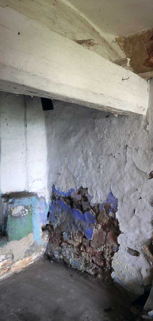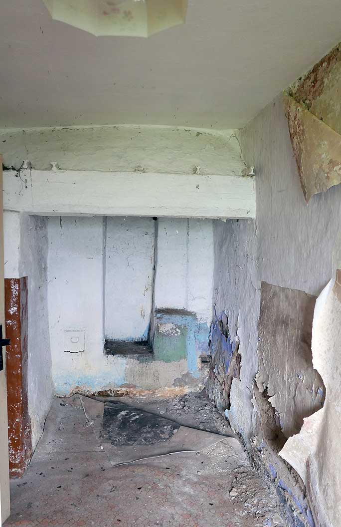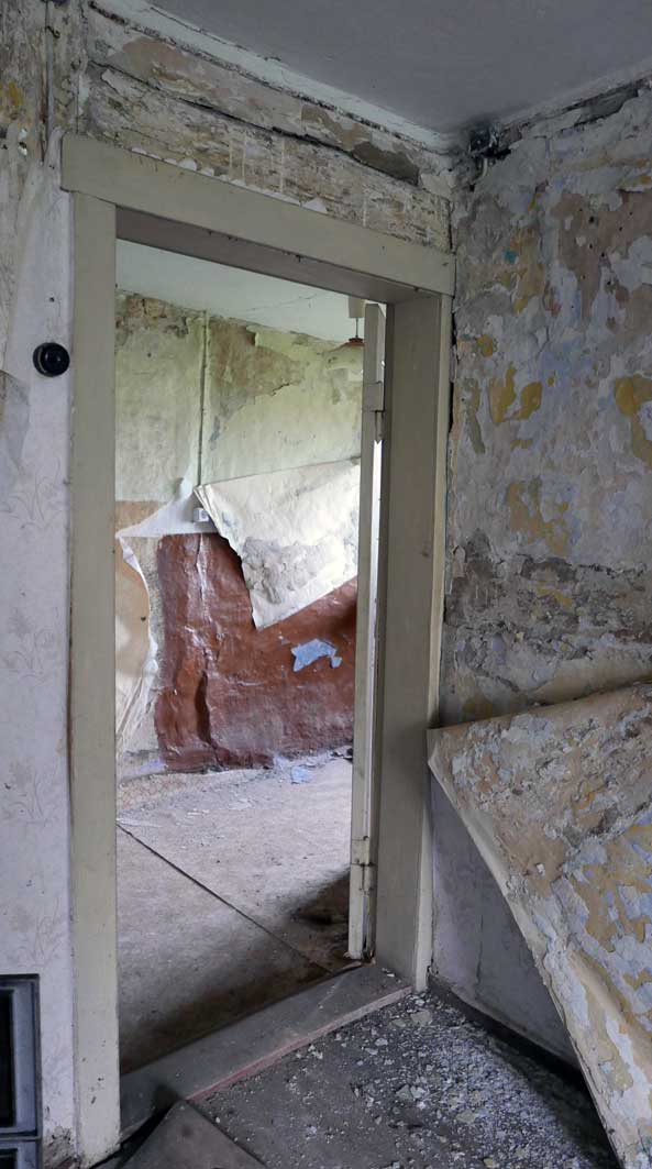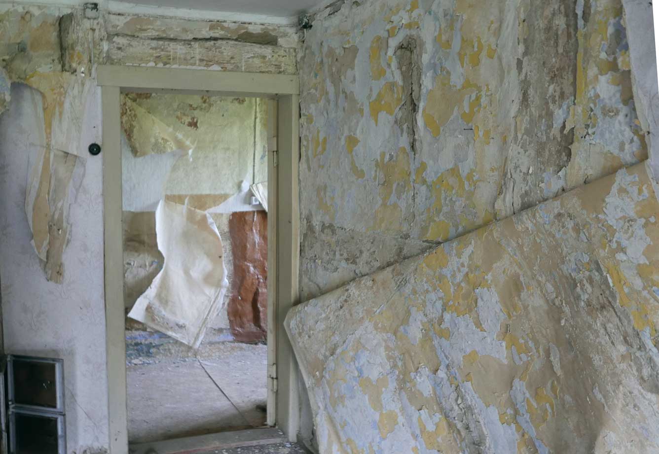 so wohnte sie seit Jahrzenhten hier . Der alte Kaminabzug mit der Feuerstelle darunter, heute zu, aber dort dann auch bei ihr der Herd. Einzig noch erhalten im Dorf. Alte Stromleiutungen und die Schichten auf den Wänden der Farbfassungen und Tapeten. Zwischen dem Fachwerk der Lehm, hier nichts durch "moderne Materialien" ersetzt.