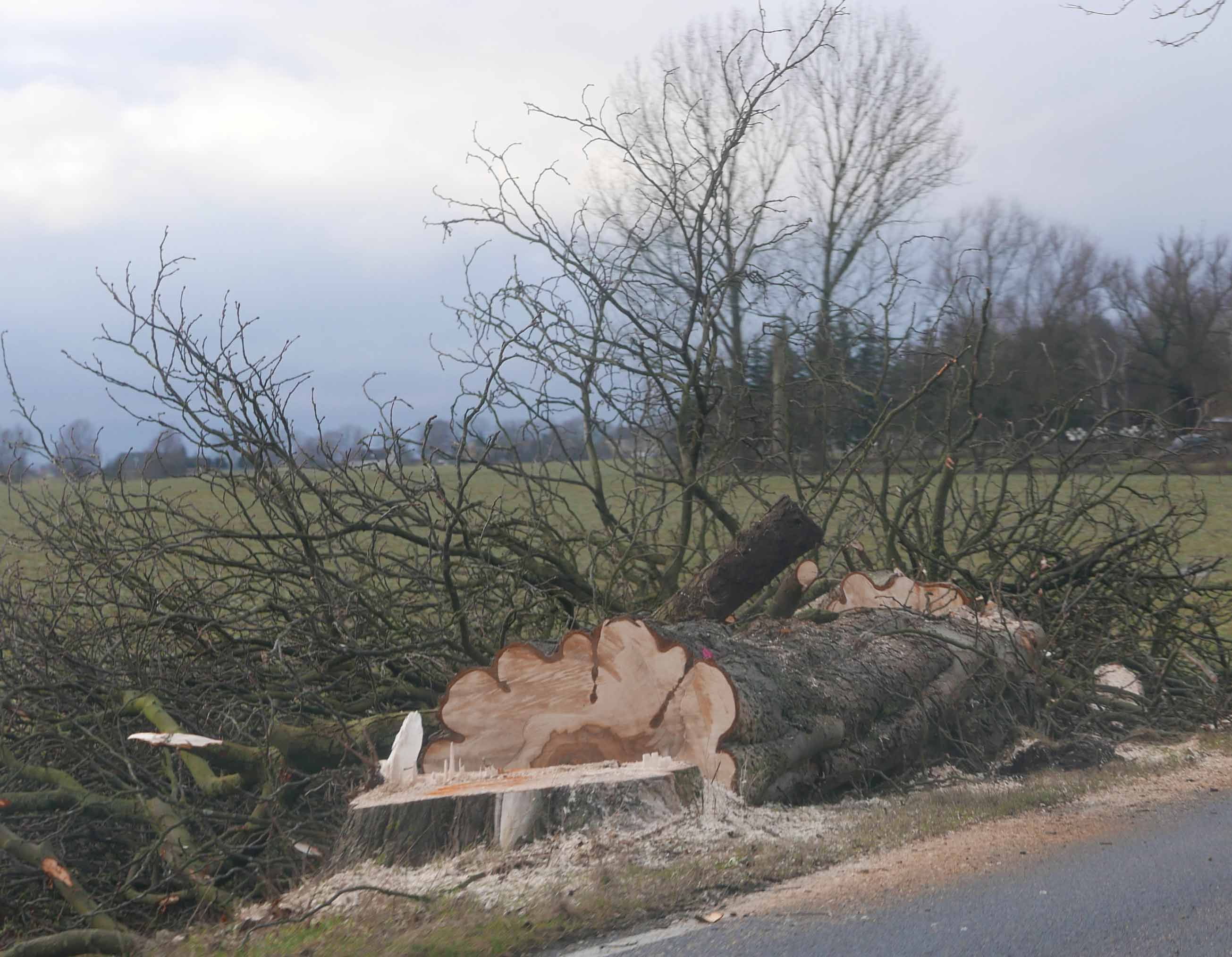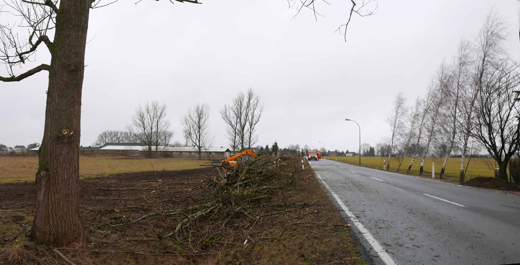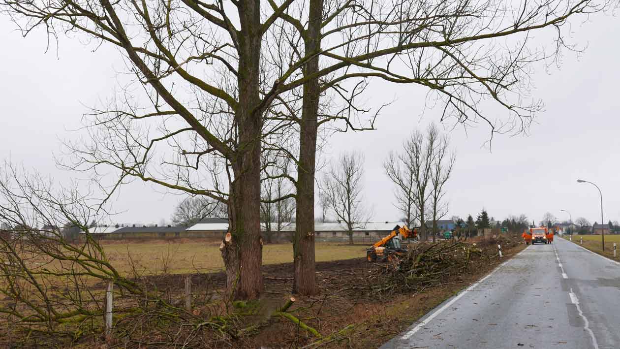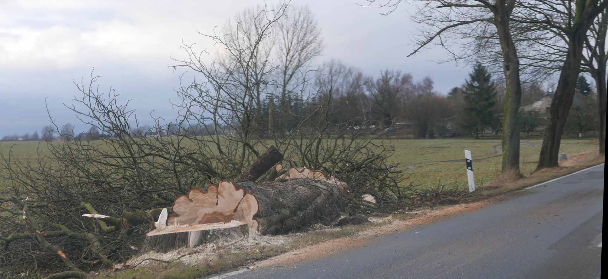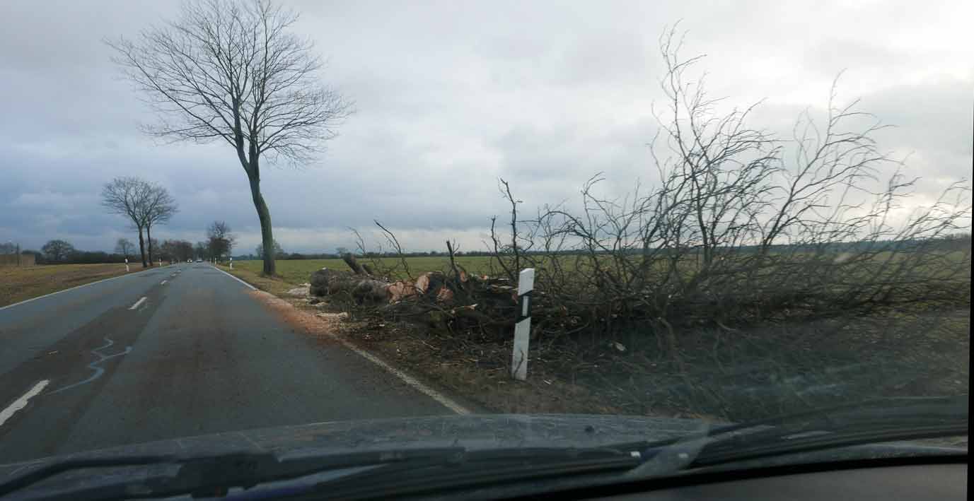 Seit Jahen fahren wir täglich auf der Strasse selbst bei Wind und Wetter, nie lag etas auf der Strasse. Die Bäume haben -hatten- keine Anzeichen von Makel eines Alters, das ihnen Anlas gab für die Sicherheit der Autos zu handeln.