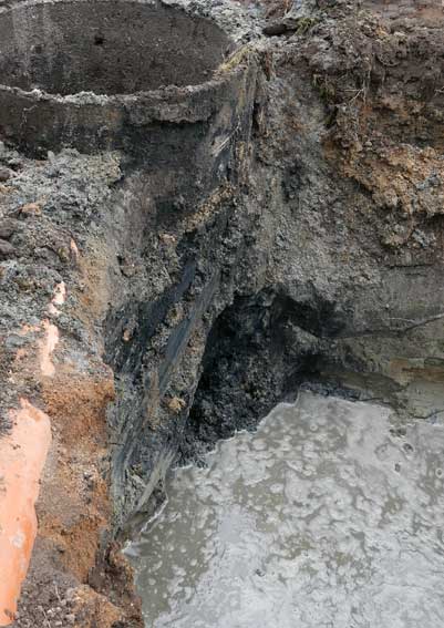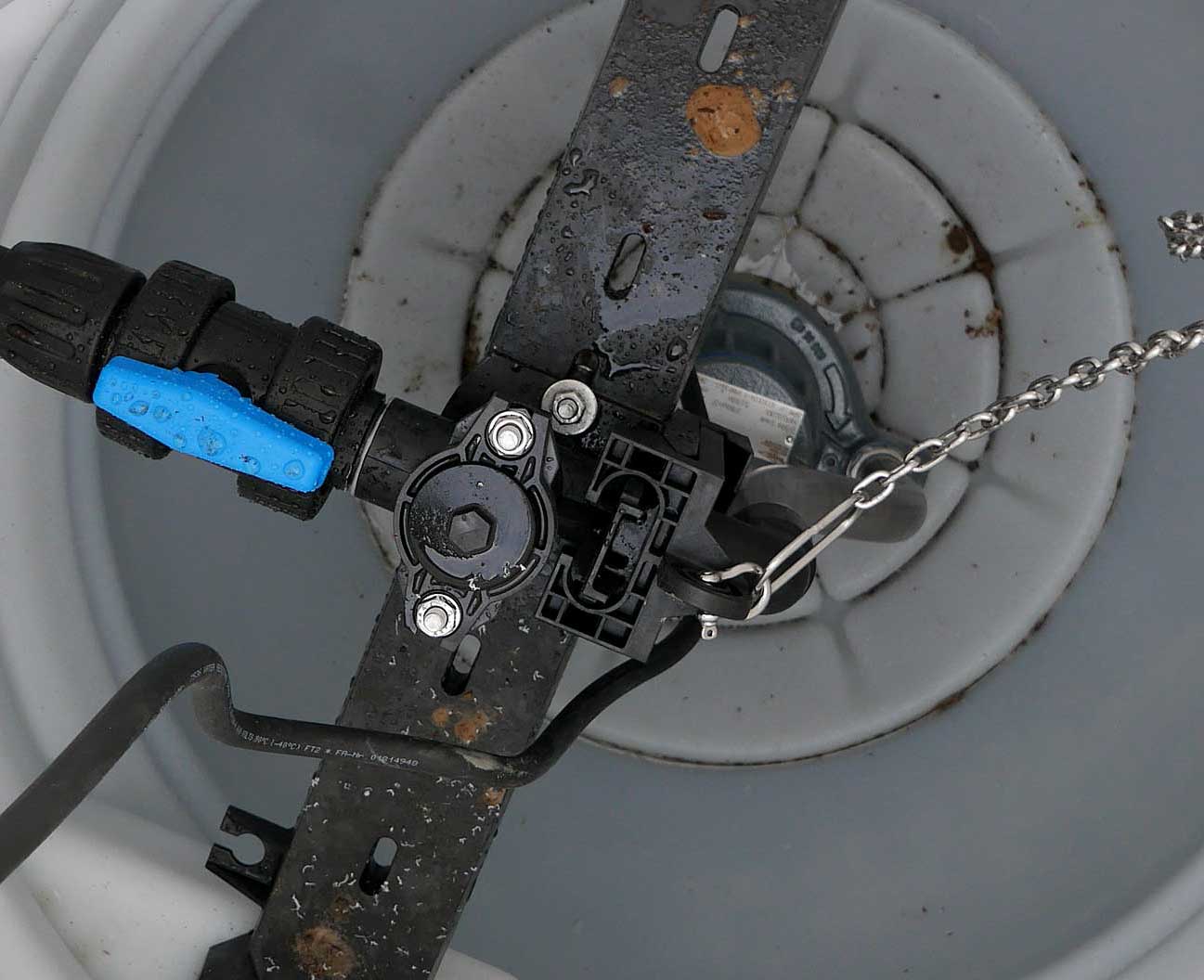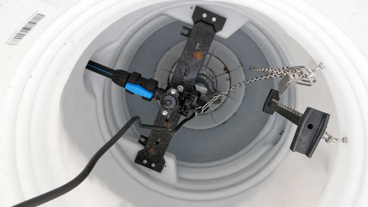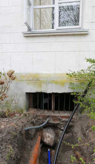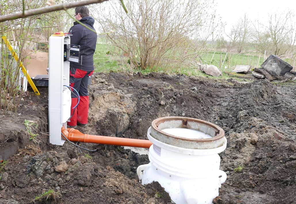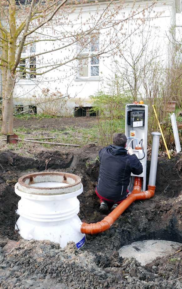wie es funktioniert. Unten die Pumpe oben der Entsorgungszufluss aus dem Haus nach der "Häckselung" der dicken Teile. Dazu die Stromversorgung über das schwarze Kabel. Alles in Plastik, was vorher Beton war und früher gemauert mit dem zwei-Kammer-System der Versickerung.