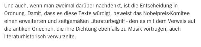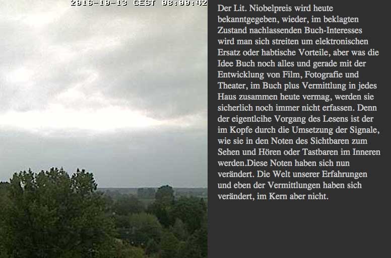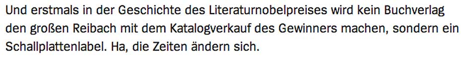 um 8 Uhr morgens als diese Seiten zum Tage gestern hochgeladen wurden, entstanden diese Texte zum Nobelpreis mit der Ruf nach einen Bruch der bisherigen Buchpreise. Denn Das Wort ist und kann soviel mehr, wenn es ernstgenommen wird.