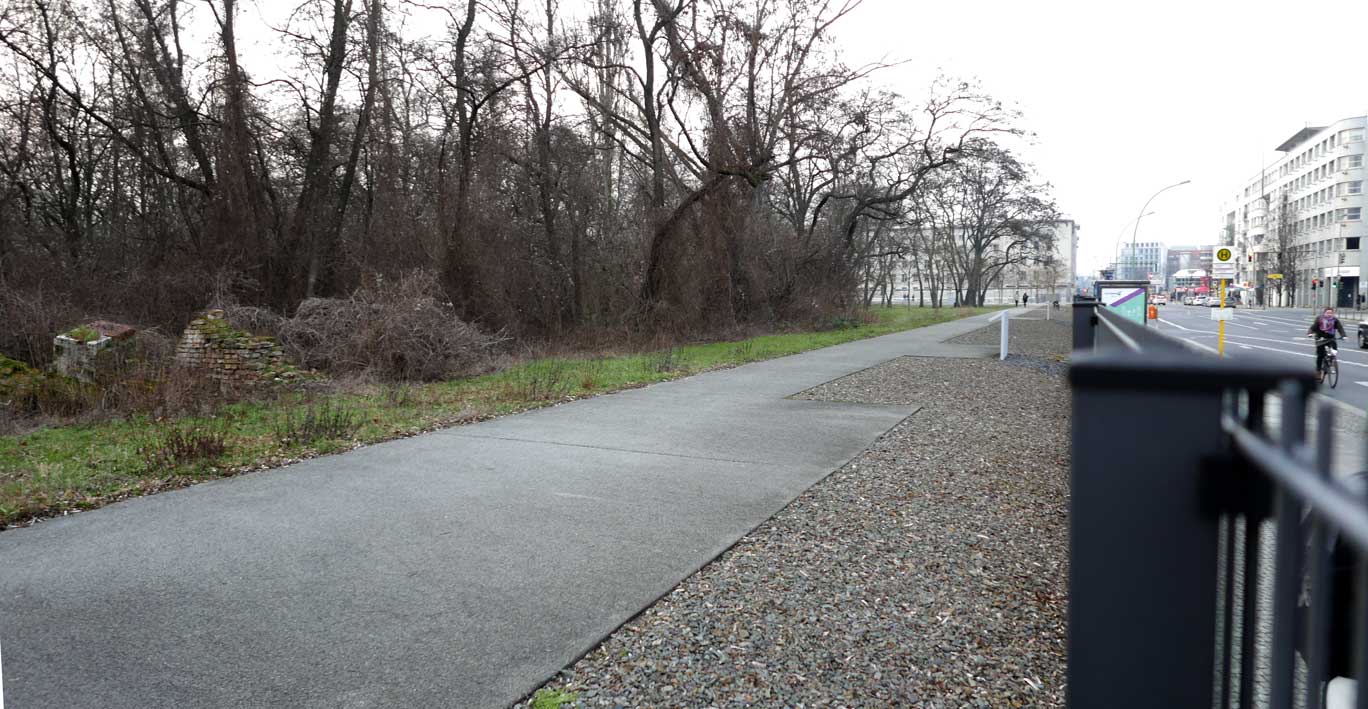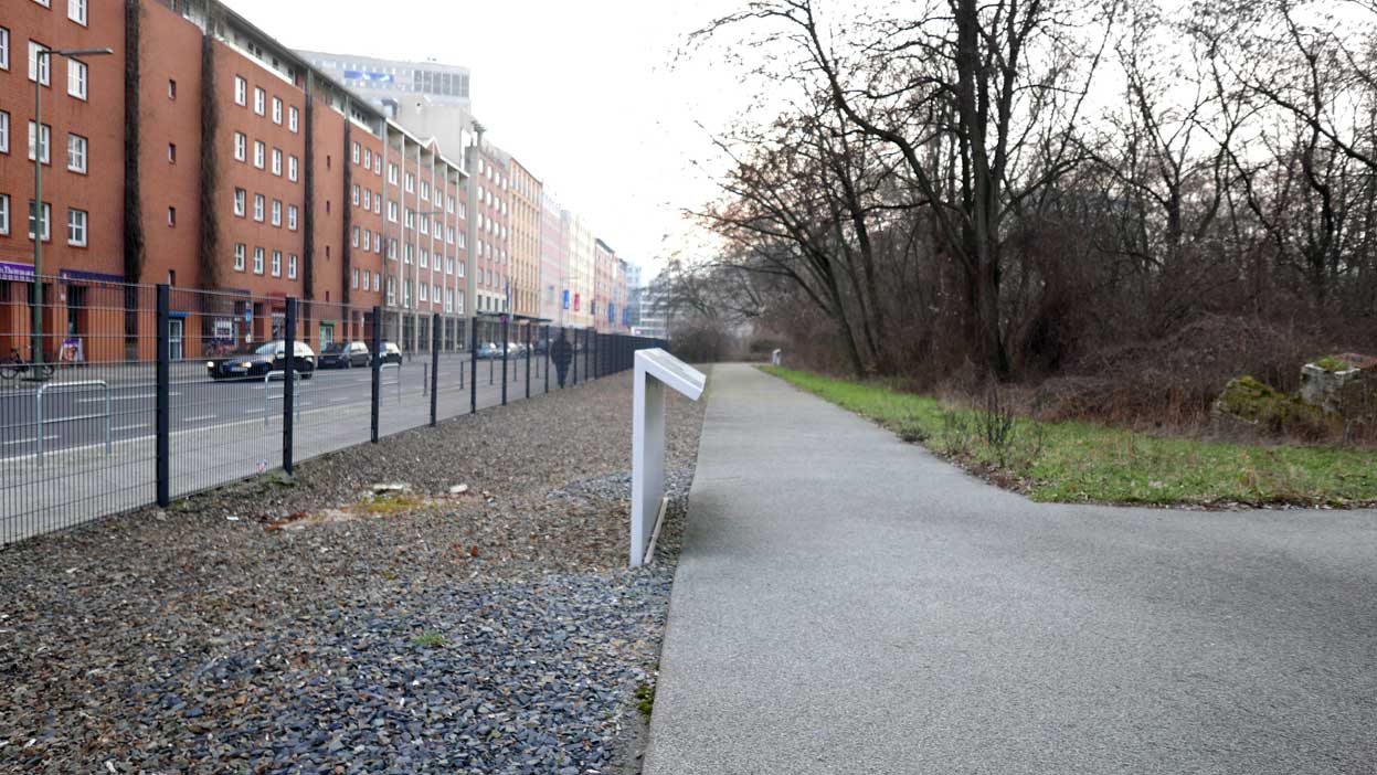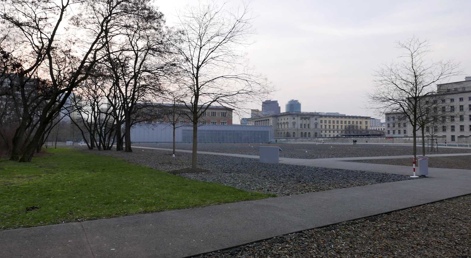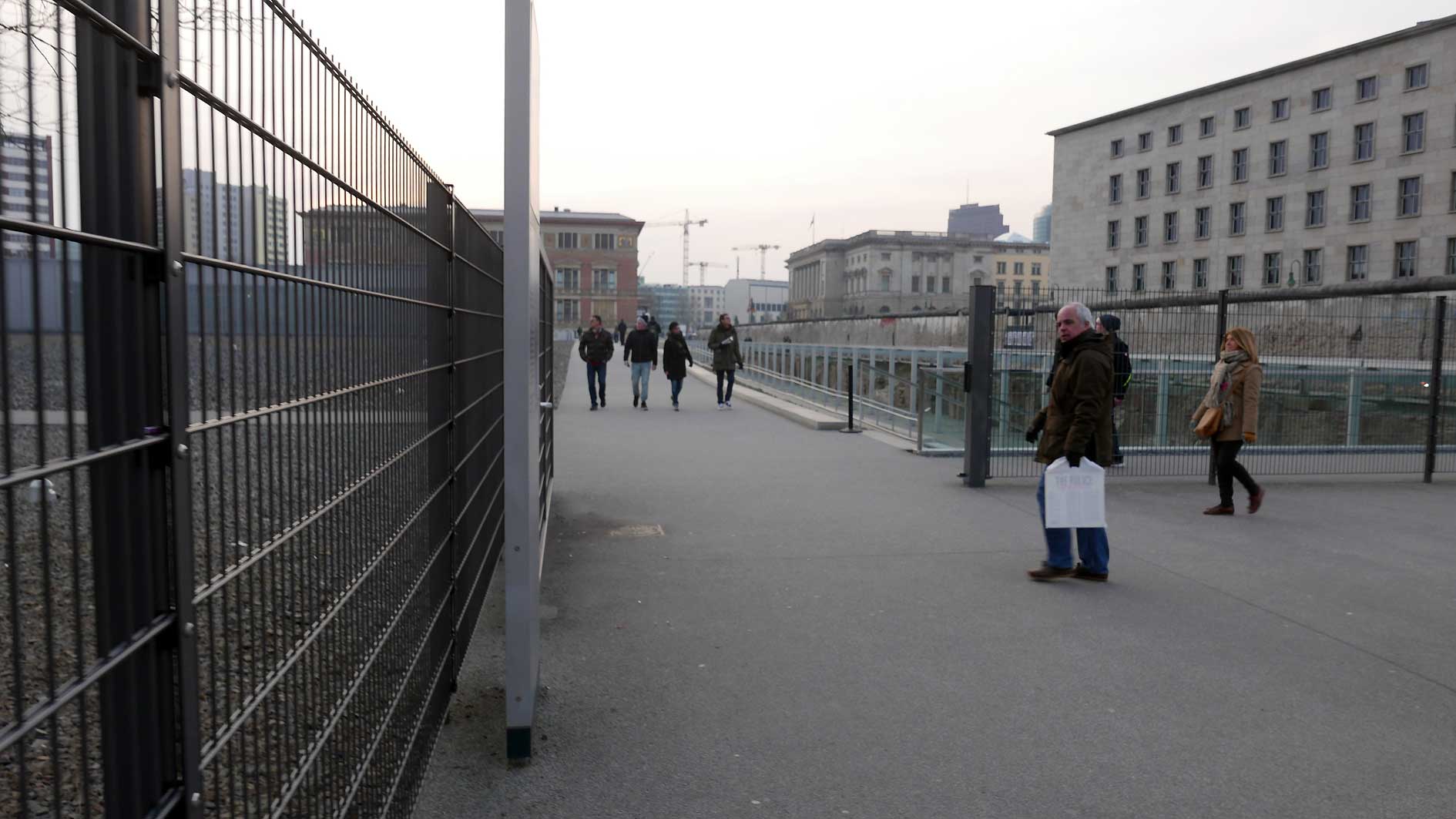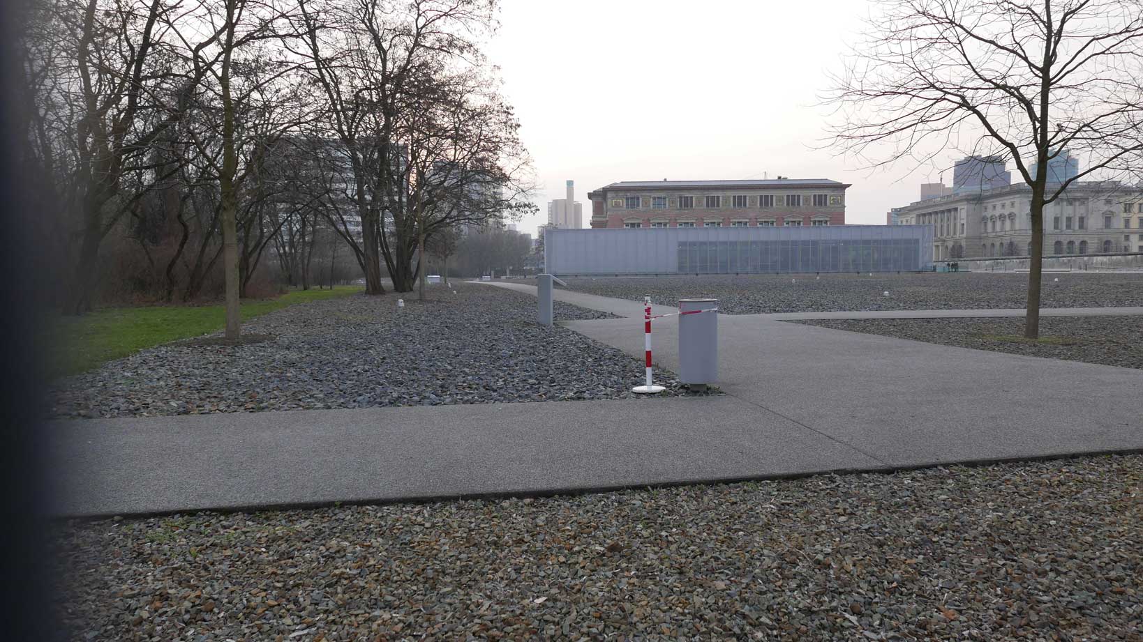 Betonierte Laufpisten und Zäune anstelle des ehem. Parks>>>>. Im Radio ein Bericht >>> zur Vorstellung des Humboldtforums im Berliner Schloss mit Foto- und Filmverbot ohne Ton-aufnahmen.