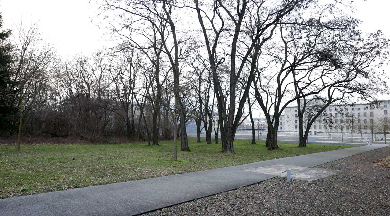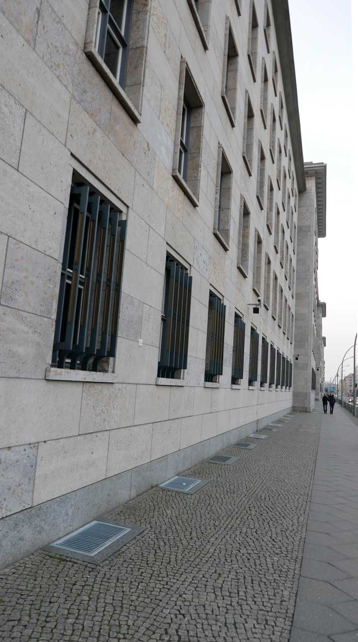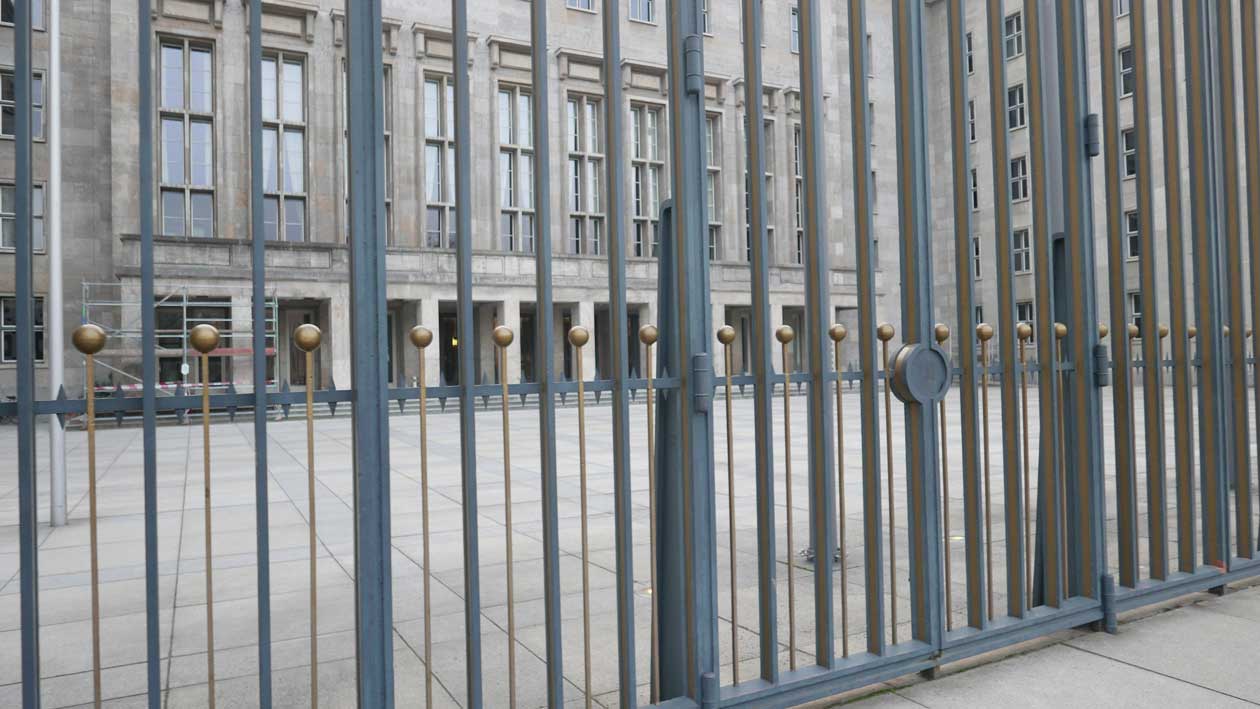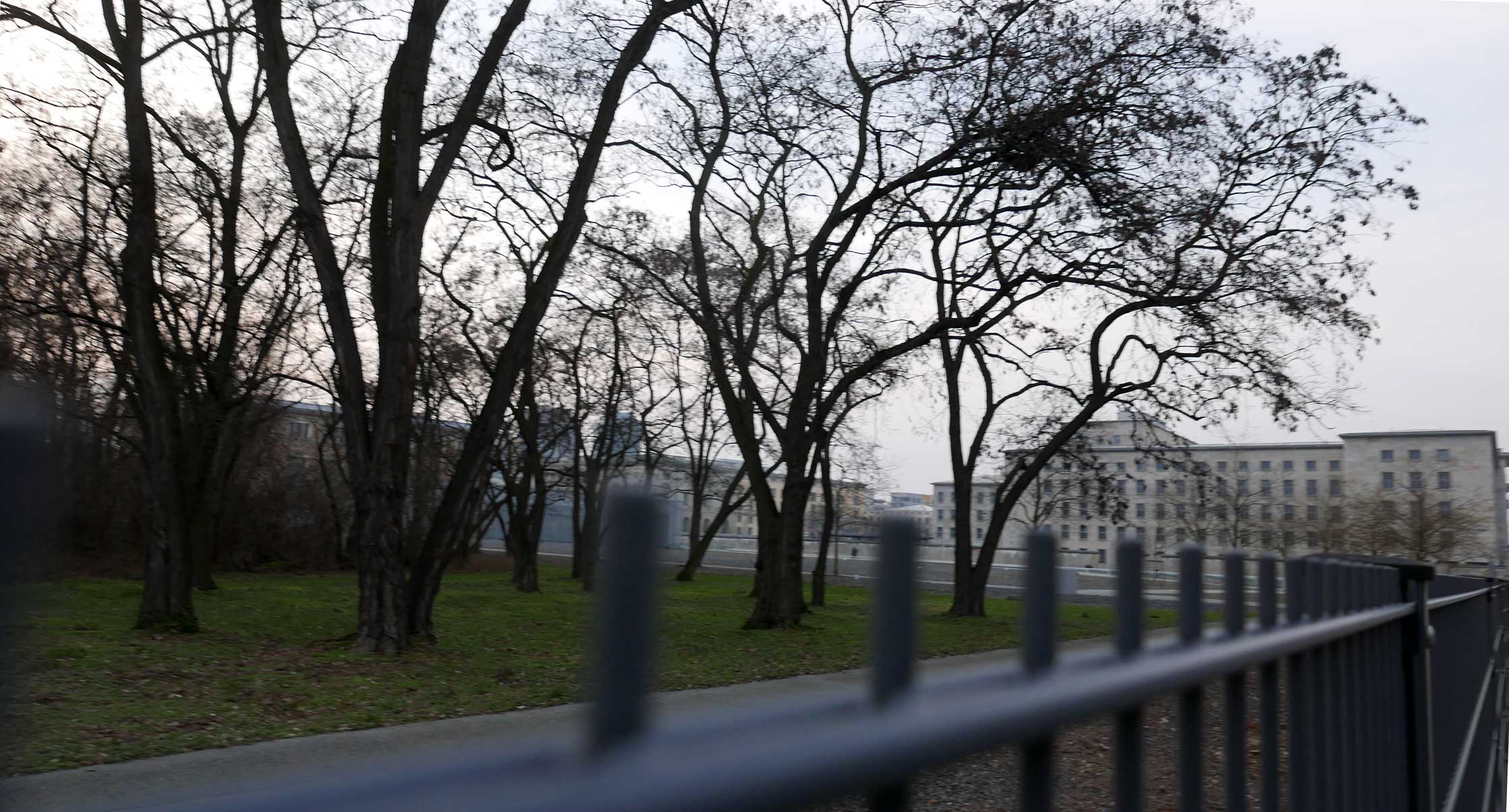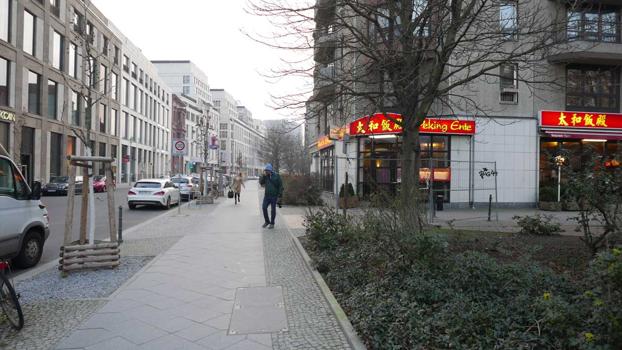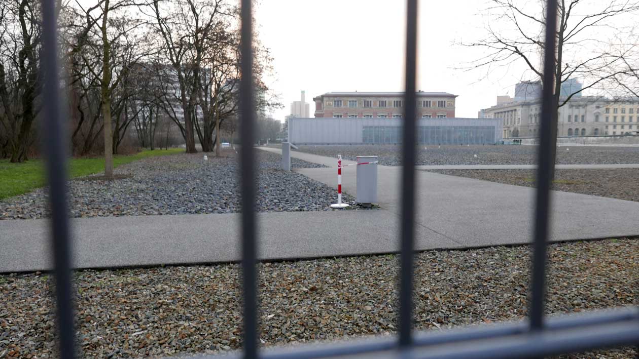 Betonierte Laufpisten und Zäune anstelle des ehem. Parks>>>>. Im Radio ein Bericht >>> zur Vorstellung des Humboldtforums im Berliner Schloss mit Foto- und Filmverbot ohne Ton-aufnahmen.