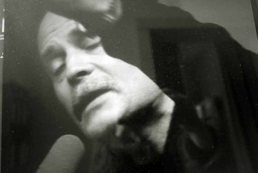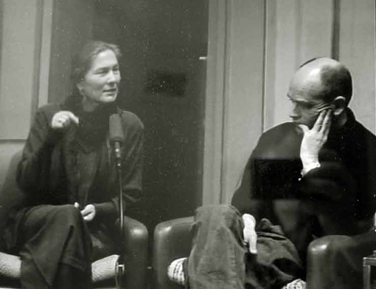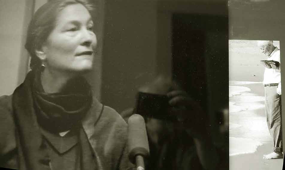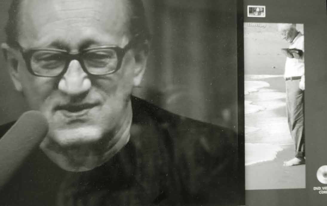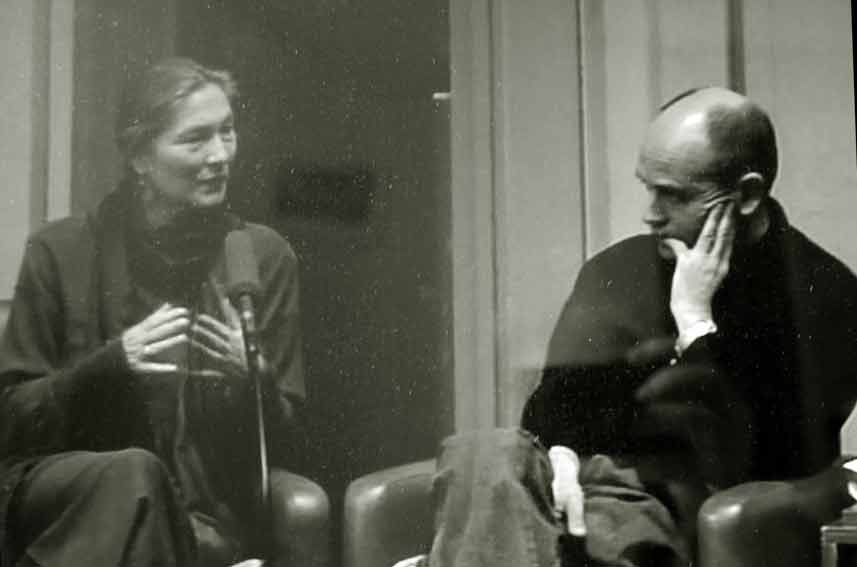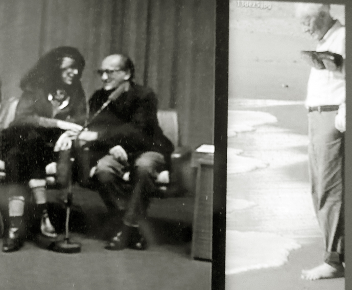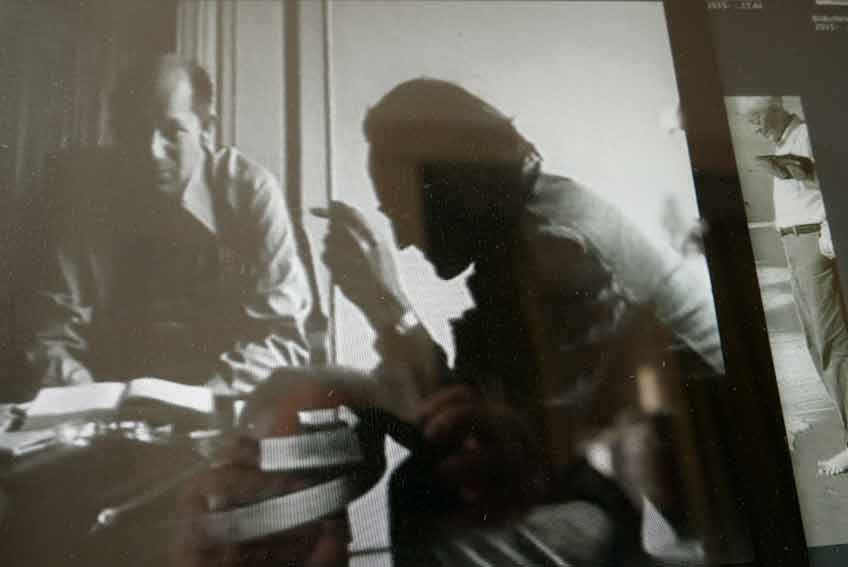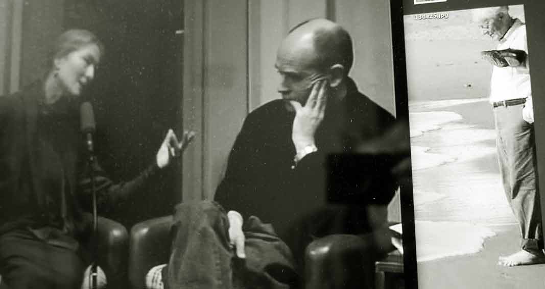 Heiner Müller -hier 1990 in der Akademie Ost- auf dem Tisch des Computers. der Autor aus dem Osten mit dem Kollegen und Freund aus dem Westen nun redend über die Schwierigkeiten wieder ein Land zu werden.