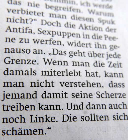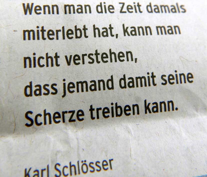 Seit die Stadt endlich das Ihre tat mit Kranz und Kreuz im Umzug der 875 Jahrfeiern des letzten Jahres muss sie sich nicht schämen vor denen, die da Kränzen in Wasser senken. Am unrechten Tag. Der 8. Mai ist nicht der Tag dieser Toten. Wer am 8. Mai kommt, ehrt die Sieger.