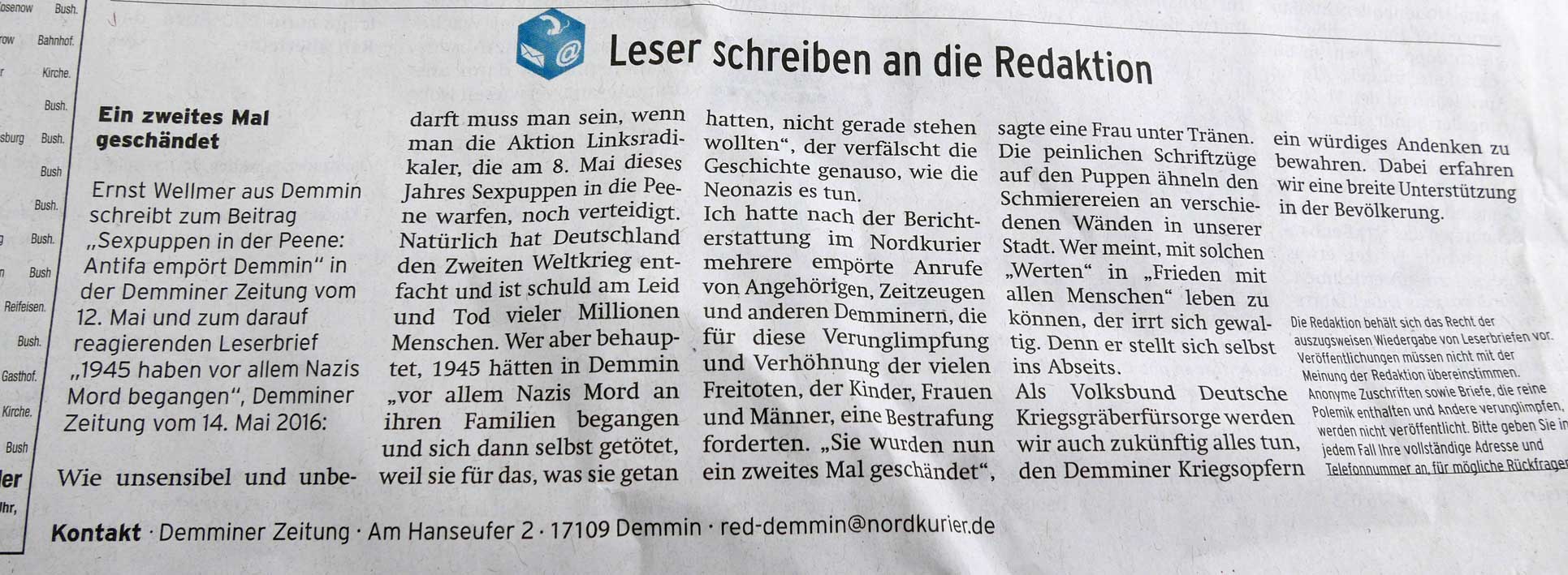Nein sie werden nichts lernen, aus einer Strafe. Und stehen nicht nur auf dem Leichenbergen der Mütter. Sind selber die Leichen, lebende, aber was für ein Leben. Wir aber würde aus der gerechtigkeit über sie Mut nehmen zum Richtigen mehr und Kraft, zu was Anderem als das, Diesen Hohn des Höllen-Gelächters der Leichen-Enkel von 45. Dies kommen aus ganz Deutschland und so sind sie es auch. Aber dies hier trägt den Namen Demmin. Abschaum aus Plastik entsorgt. Anfarge wo ist das hingekommen. Ohne Regionalmuseum einfach weg? Installtionen aus Schmutz ist leherreicher als viele Madonnen heute. Über das wer wir sind.