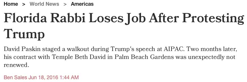 Nachdem der Rabbi D.P. die Rede von Trump auf der grössten jüdischen Gruppierung Aipag in den USA verliess, wurde sein Vertrag nicht mehr erneuert.