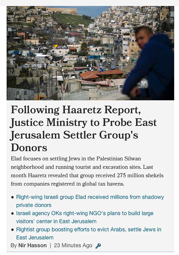 Elad konzentriert sich Juden in der palästinensischen Silwan Nachbarschaft und in touristischen- und Aus-Grabungsstätten anzusiedeln. Aufdeckung von Haaretz vergangenen Monat ergaben, dass diese Gruppe von Unternehmen -in globalen Steuerparadiesen registriert- 275 Millionen Schekelen erhalten haben.
