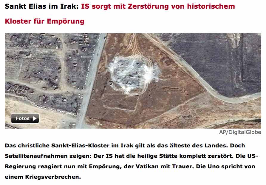 Auf Satellitenfotos, die vor der Zerstörung aufgenommen wurden, seien 26 unterschiedliche Räume des Klosters zu erkennen gewesen, darunter eine Kapelle, sagte der US-Experte für Bildanalysen, Stephen Wood. Über die Nachher-Aufnahmen sagte er: "Bulldozer, schweres Geschütz, Vorschlaghammer und womöglich Sprengstoff haben die Wände aus Stein in ein Feld aus grauweißem Staub verwandelt. Sie haben es komplett zerstört."