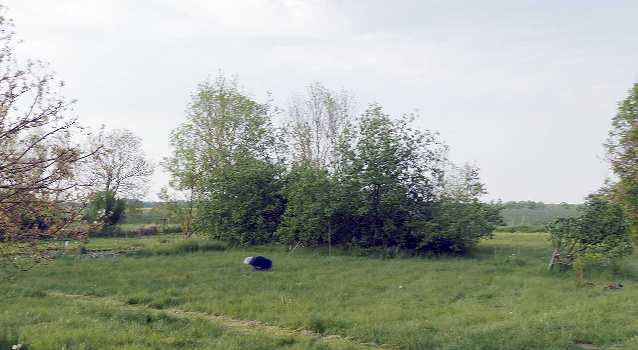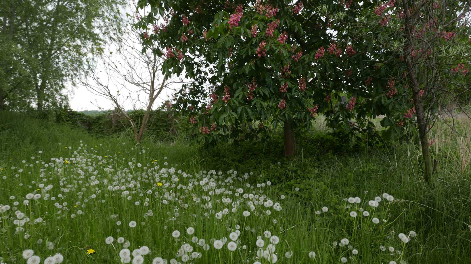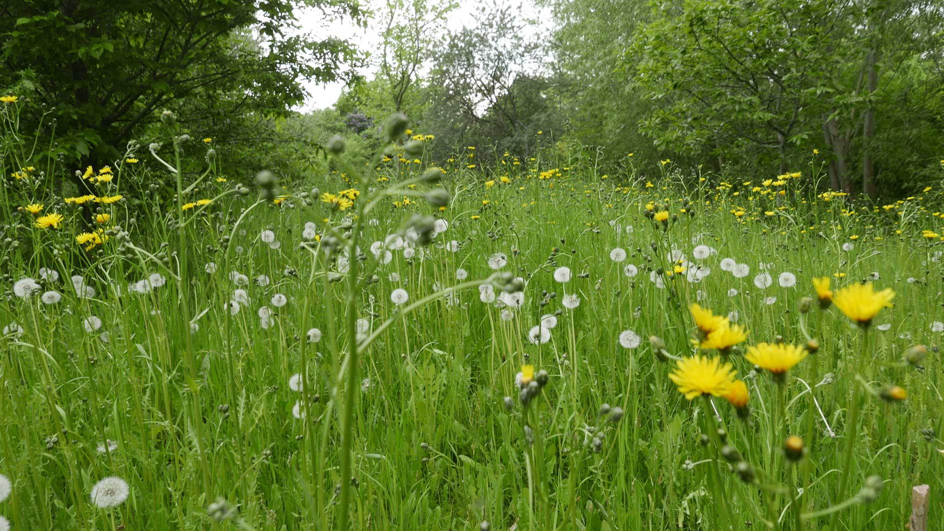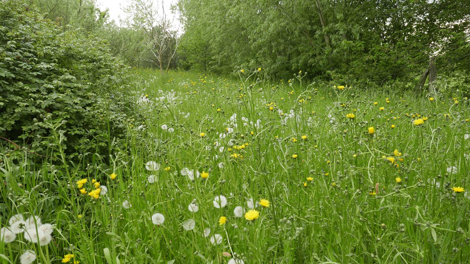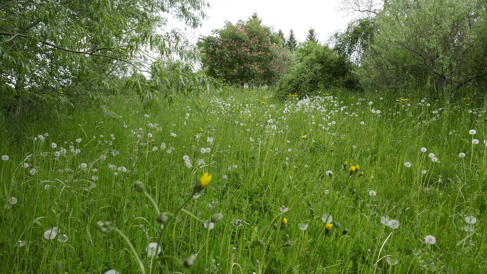 zwischen wildwucherndem Gras nach dem Winter befreit und von der Wühlmaus von unten angefallen