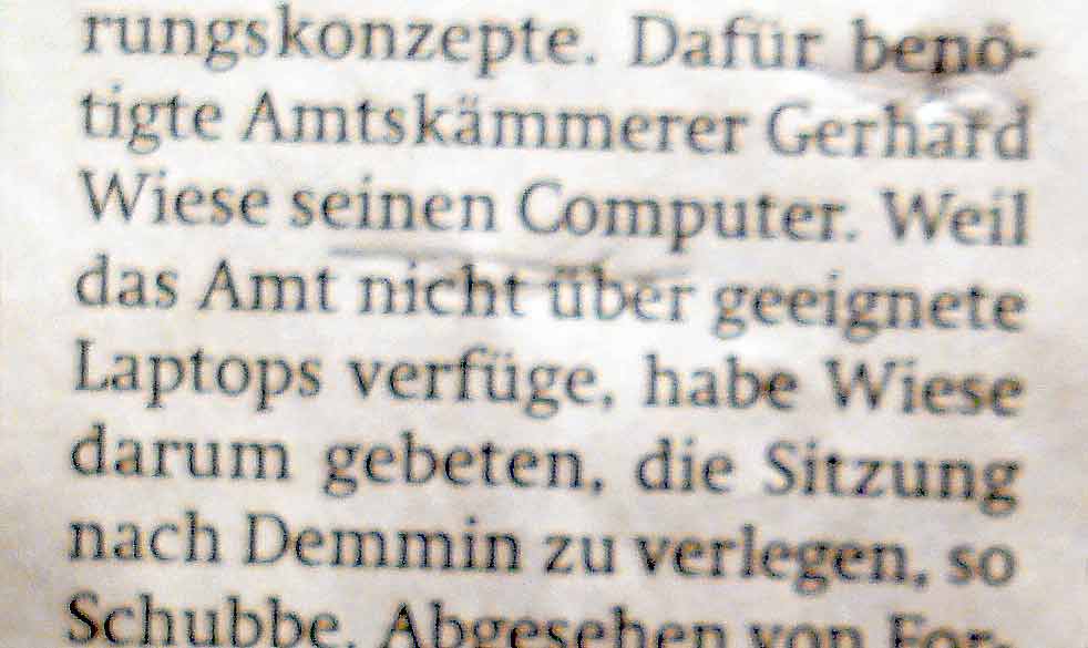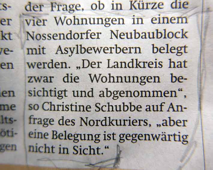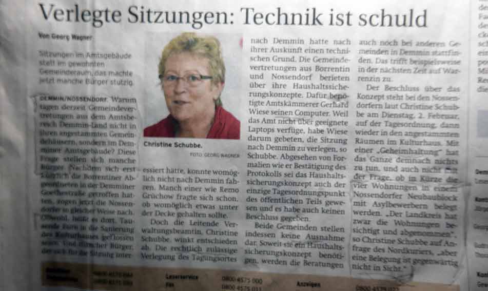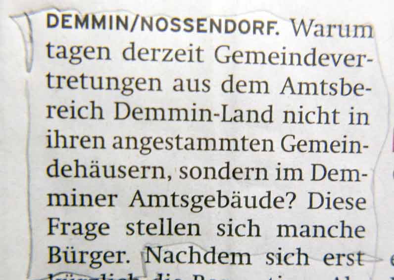 Die langsame Gewöhnung an Demmin als Ort für Nossendorfer Gemeindefragen. Wie wache Bürgerstimmen solche Fragen öffentlich machen können. Dass die Anwendung eines Computers bestimmt, wo gehandelt wird. Und wie alle Subventionszuwendungen als Wahlgeschenke zugunsten der derzeitige Bürgermeistersituation mit 180 000-120 000 Euro zur Sanierung von "Kita" und "Kultur"-Haus daran nichts ändern, dass das Amt Demmin folgerichtig das Dilemma Nossendorf in seiner Lähmung lösen muss. Es ist ein Zeichen zur Auflösung der Suveränität der Dörfer. Der Computer bringt es an den Tag.