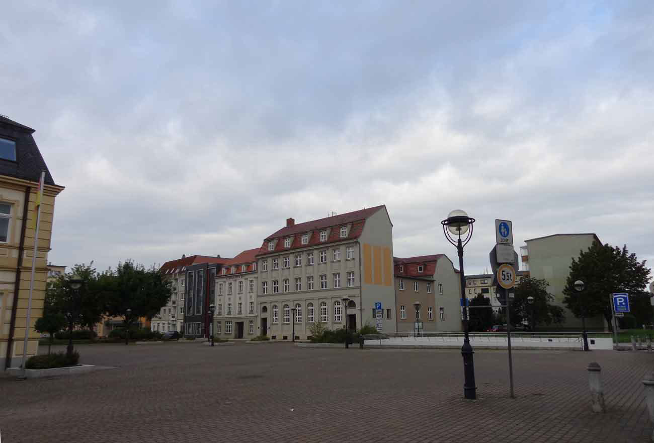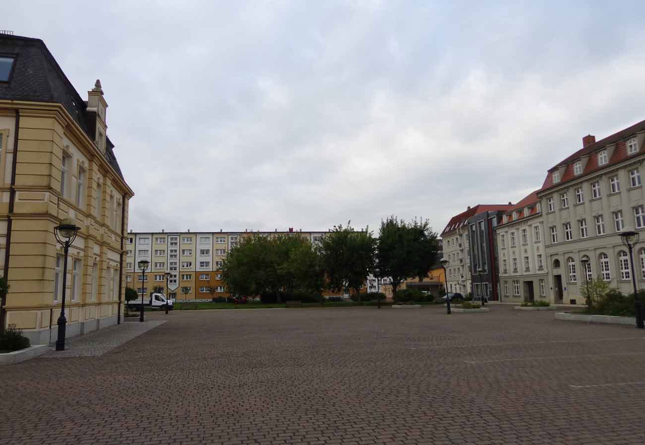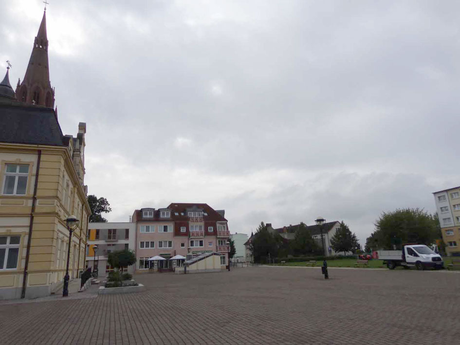 Der Markt in Demmin am Morgen aufgenommen(MG).Dies war einmal die grosse Schauseite der Stadt. Im Vorzimmer des Bürgermeisters an der Wand . Vor 45