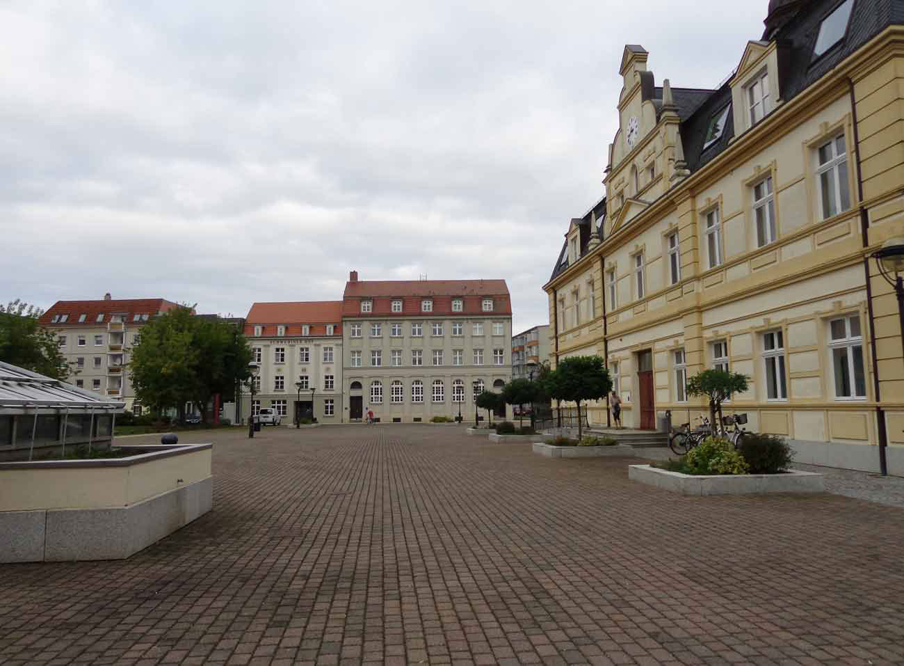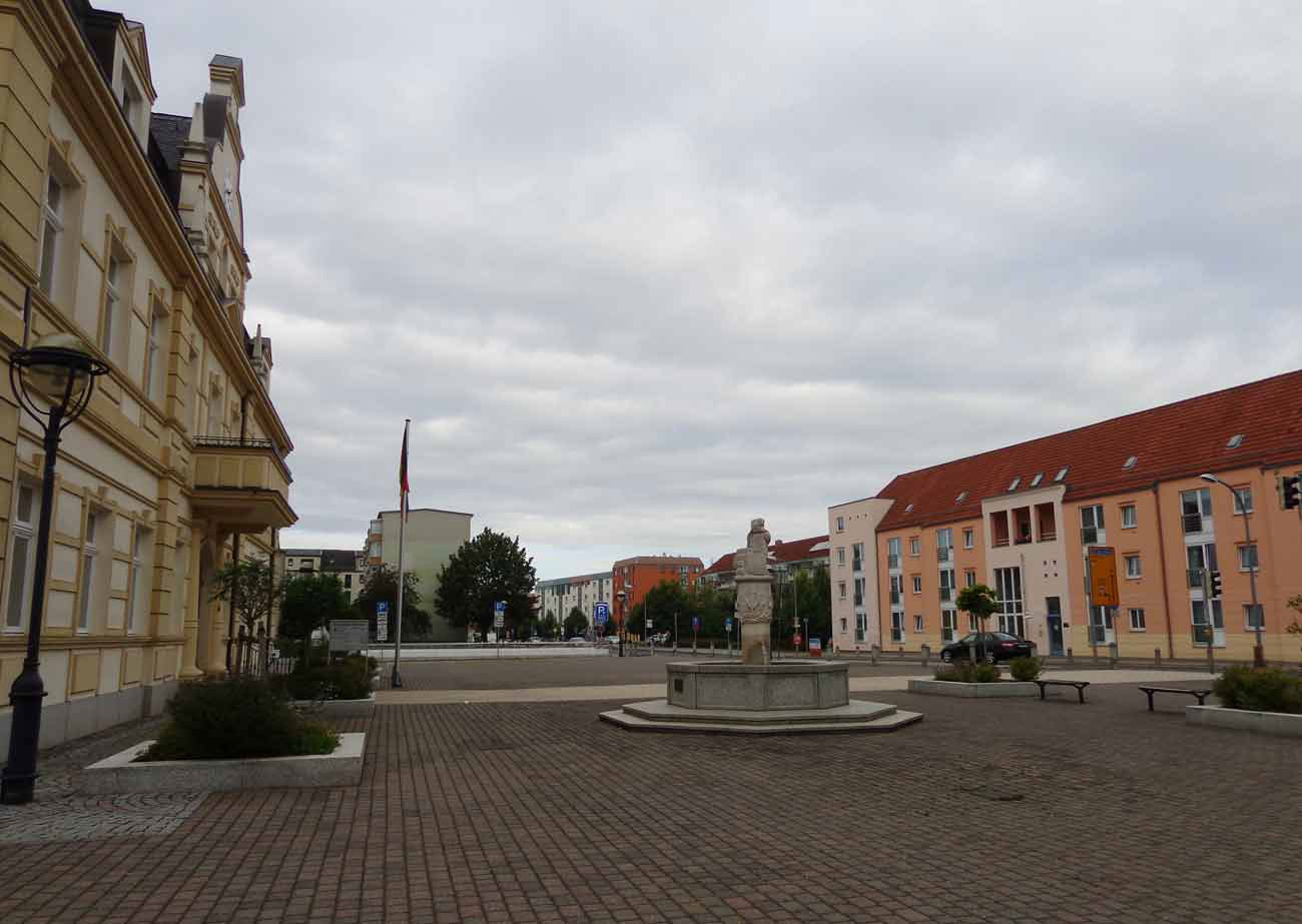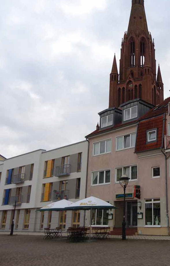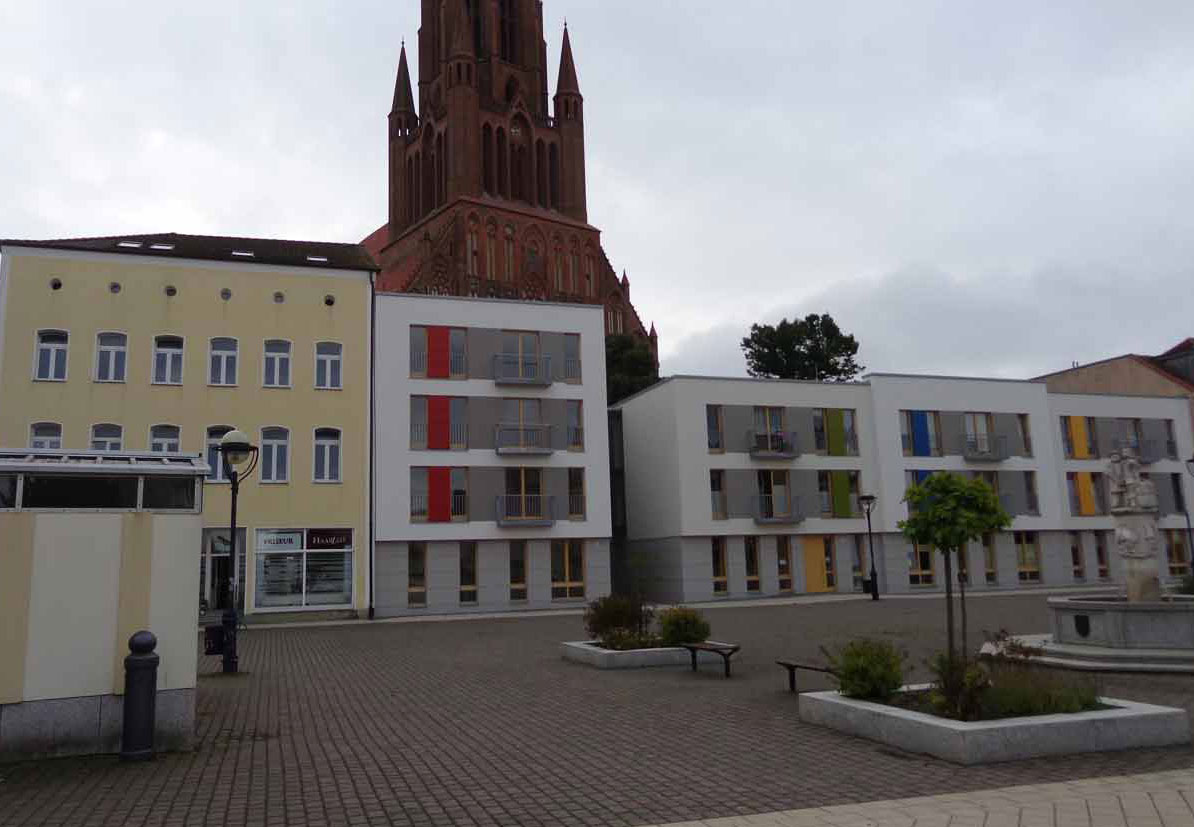 Der Markt in Demmin am Morgen aufgenommen(MG).Dies war einmal die grosse Schauseite der Stadt. Im Vorzimmer des Bürgermeisters an der Wand . Vor 45