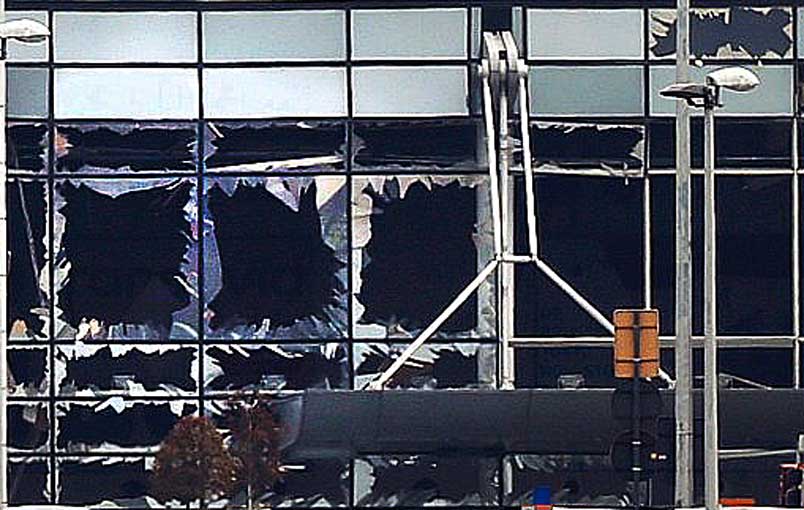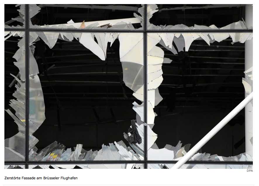 Alle sprechen vom Zersplilttern der grossen Glaswand des Flughafengebäudes in Brüssel. Warum zeigen ihre live-Kameras es nicht. Sie zeigen die herabgefallenenen Trümmer der Decke der ganzen Gebäudehalle, warum sehen wir es nicht fallen. Sie sagen, wir soillten von Israel lernen wie man das macht mit solchen Attacken um zugehen. Aber sie sprechen aus dem Getto eines ganzen Landes als Hochsicherheitstrakts zu dem sie Palästina, das heilige Land, gemacht haben. Mit täglichen Toten von Tag zu Tag, umgeben von Feinden und Zerstörung rundum. als Modell der Welt? shalom hiess einmal was anderes.