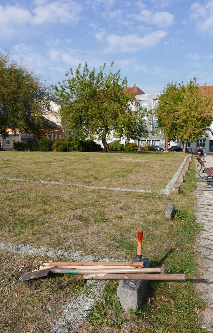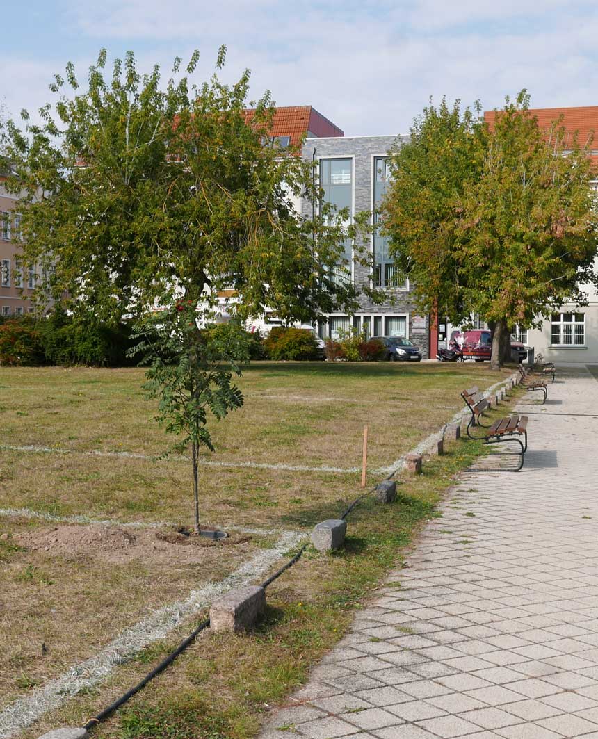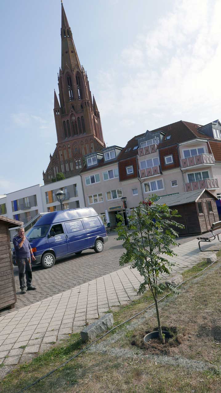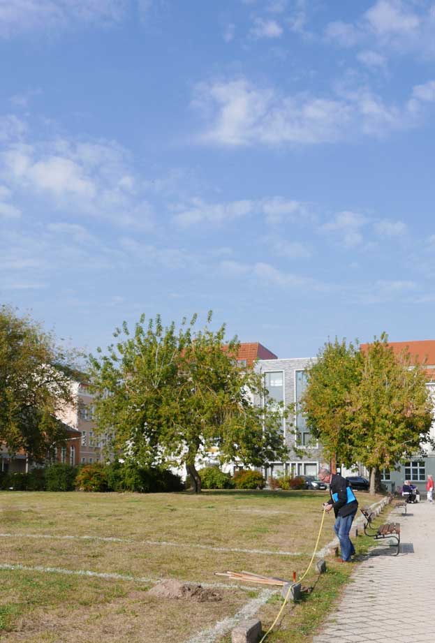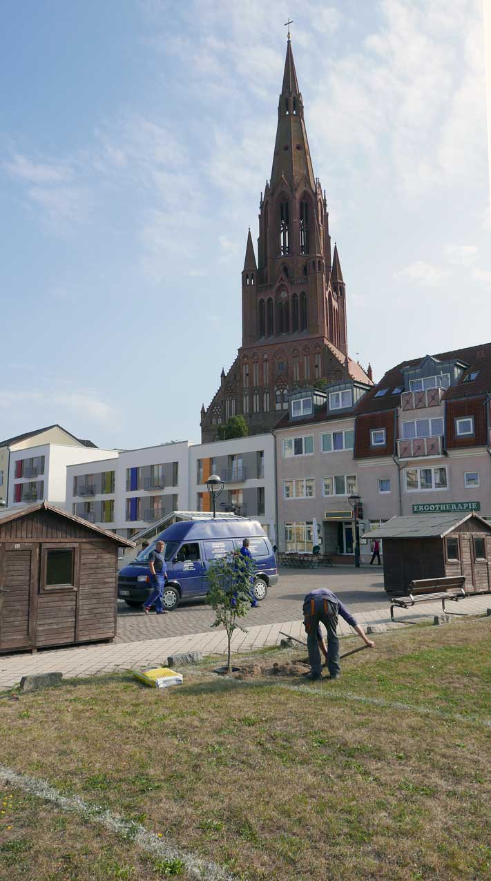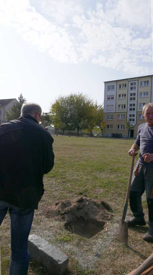 Proben, was wird da drunter sein. Und gerade das Drunter ist das was uns blieb. Darüber nun die jungen Bäume. Die Stundent aus Norwegen habens installiert, was blieb von 2 Wochen Demmin, und selbst aus verschiedenen Ländern. Der Welt. Nu in Demmin heute. Messer wirs ab,