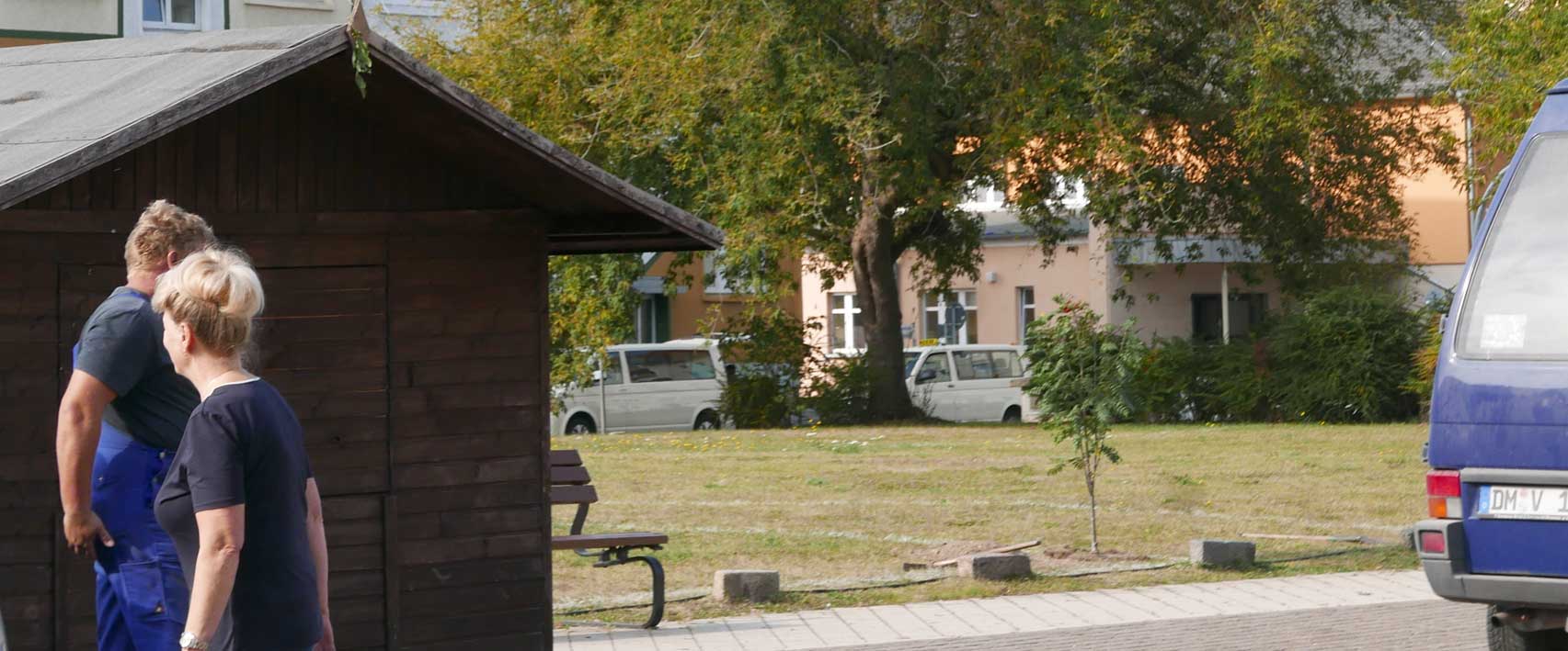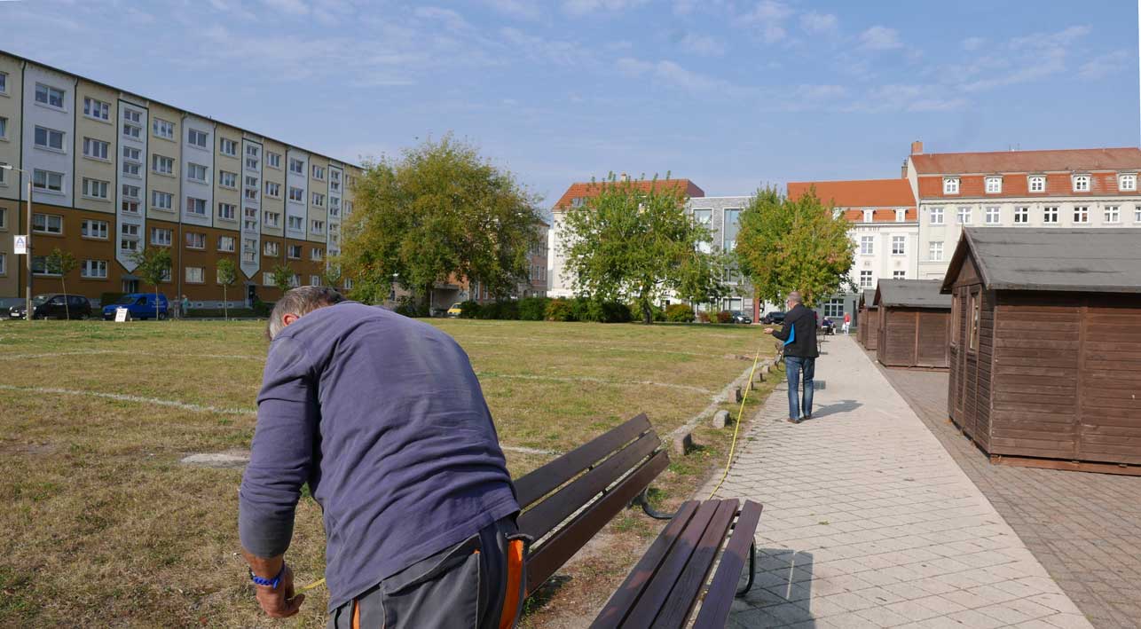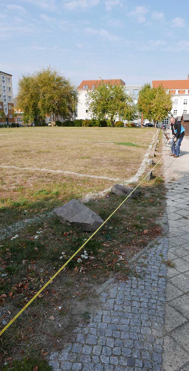 Das Grund-Stück der ehemaligen Bäckerei David an der Ecke des Gangs früher, gehört noch nicht dazu, wenn man es von der Stadt bebauen will, pflanzen, also Abstand halten , messen, markieren. Genau.