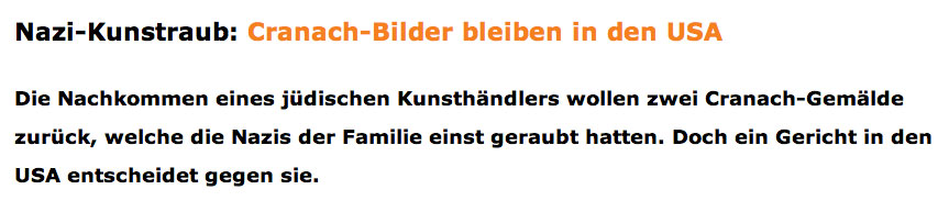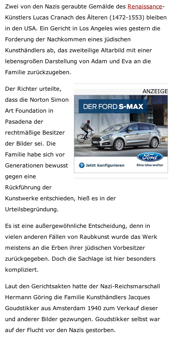 In den beiden Bildern von Adam und Eva stehend als Version von L. Cranach, die nun Gegenstand einer gerichtlichen Auseinandersetzung in den USA wurden, geht es denn auch um mehr als um Besitzrechte und Geld -Die Ausstellung in Berlin die mit Adam und Eva begiunnt, heisst DAS KAPITAL- und es geht hier bei den Cranch-Bilder von Adam und Eva um eine Geschichte von 100 Jahren. Von Russland in St. Pertersburg bis Passadena in Amerika. Durch Europa in Deutschland zwischen den Kriegen in Berlin.