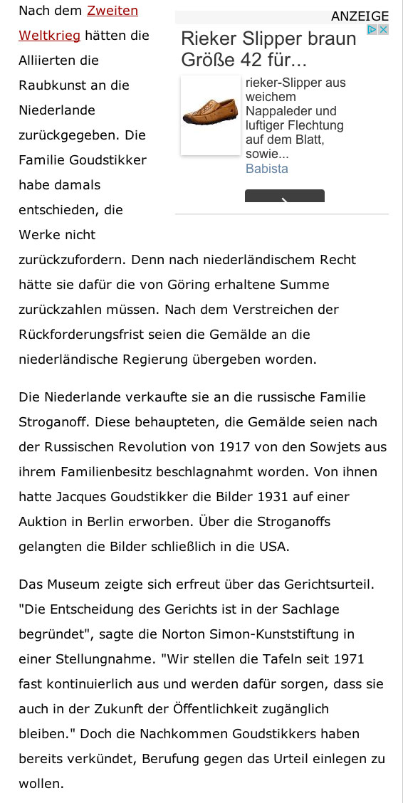Und kein Raubzug der Nazis, sondern es wurde soviel gezahlt, dass die jüdischen Vorbesitzer lieber den Deal mit den Göring-Unterhändlern vorzogen, als das Geld zurückzuzgeben, wenn sie dafür die Bilder wiederhaben wollten. Also ein gutes Geschäft gewesen. Die Bilder selbst ohne Interesse.