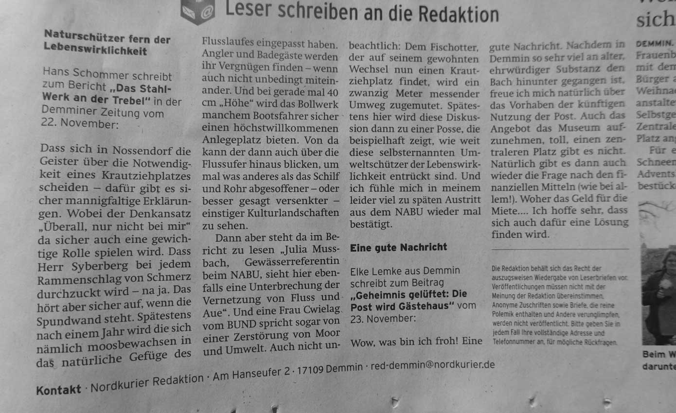 Bauzeitliche Informationstafeln sind Gegenstand der Öffentlichkeitsarbeit zu Baustellen. Angesichts der Abgelegenheit und Ortsferne der Krautungsstation in Nossendorf hatte sich das StALU gegen den Einsatz von Projektmitteln für diesen Zweck entschieden und statt dessen Vertreter der Gemeinde zu allen Bauberatungen eingeladen, was in vergleichbaren Situationen durchaus üblich ist. Wir werden die diesbezüglich gemachten Erfahrungen für künftige Projekte auswerten.Angesichts des Standes der Projektumsetzung wäre die Aufstellung einer Tafel in dem von Ihnen angeregten Format jetzt nicht mehr sinnvoll. Ich habe deshalb veranlasst, dass die begehrten Informationen (wie für Nehringen) unverzüglich auf einer hier erstellten Tafel im Format A 3 an der Baustelle bereitgestellt werden.Wie ich auch mit meinem Besuch vor Ort am 4.11.16 verdeutlichen wollte ist mir an Transparenz und Akzeptanz der Maßnahmen des StALU sehr gelegen.