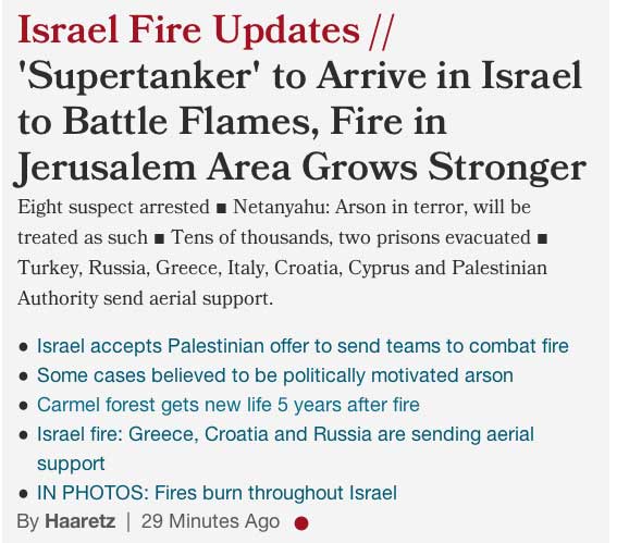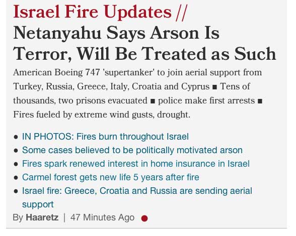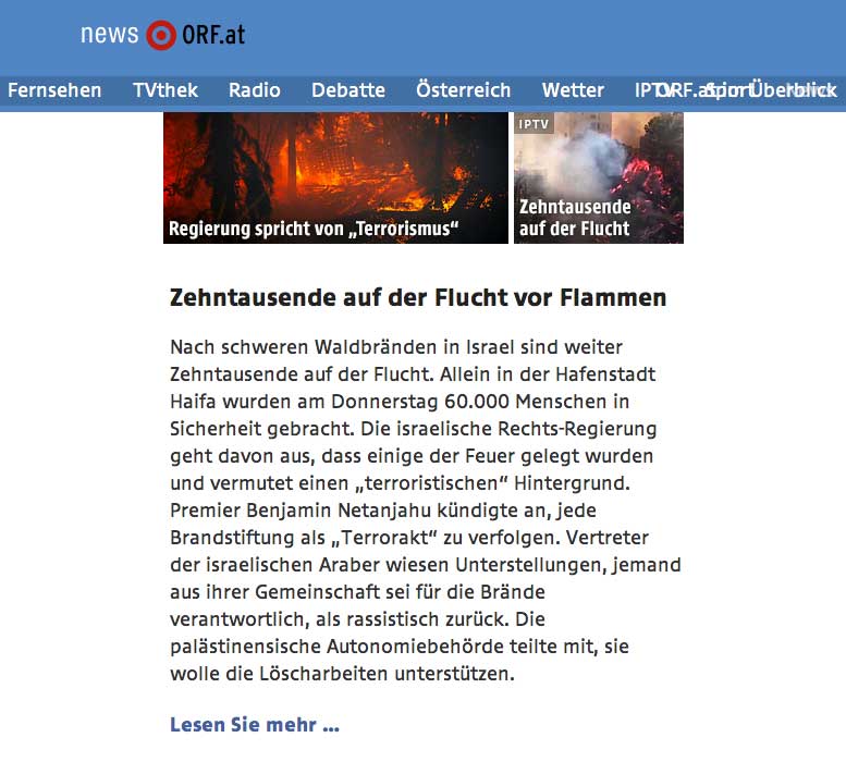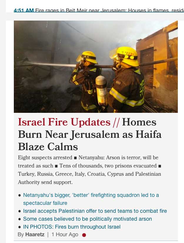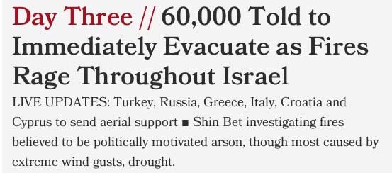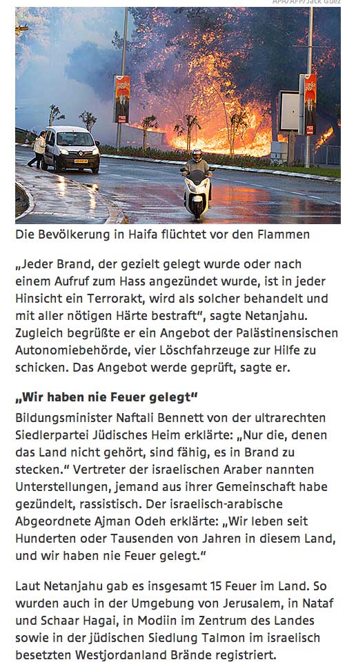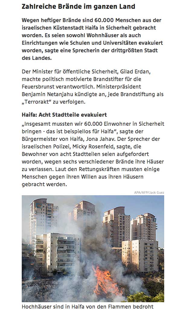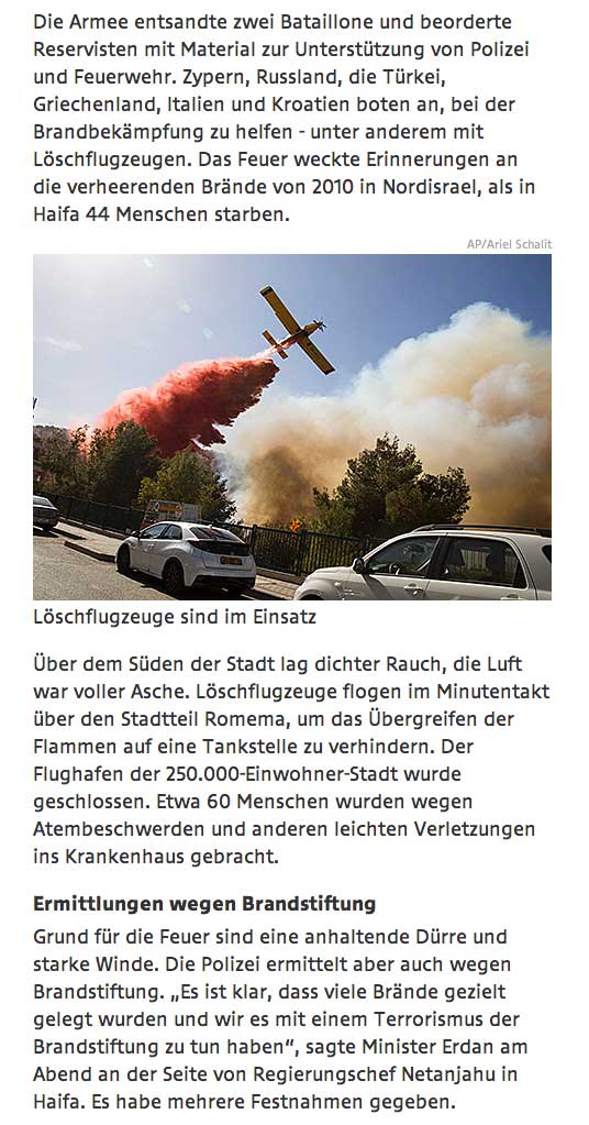 Tel Aviv (dpa). Grossbrände halten seit Tagen die Einsatzkräfte in Israel in Atem. Besonders dramatisch ist die Lage in der Hafenstadt Haifa. In einigen Fällen soll es sich um Brandstiftung durch PalŠstinenser handeln. Zehntausende Israelis sind vor den verheerenden BrŠnden in Haifa geflohen. Rund 75 000 Menschen waren nach Medienberichten betroffen, gut ein Viertel der Bewohner der KŸütenstadt. 60 Menschen wurden nach Angaben der Rettungskräfte in Haifa verletzt. Hunderte EinsatzkrŠfte kŠmpfen gegen die Flammen.