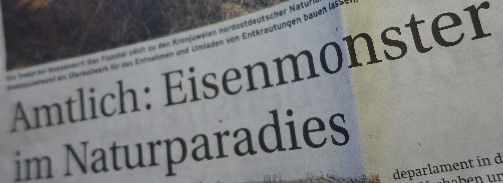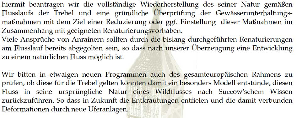 In Sachen Trebel sind die Weichen gestellt. Der wichtigste Hüter des Flusses, ein Schäfer und OProfessor und Nobelpreisträger des alternativen Lebens aus dem eigenenen Lande, hat gesagt, was dieser Trebel guttut, die obersten Programme der EU bereiten den Weg, die Menschen der Dörfen, hilflos und eingeschüchtert durch die Vergangeheit, wollen das alles nicht anders, wir wissen, es schadet niemand, wenn das Wasser wieder fliesst wie immer.