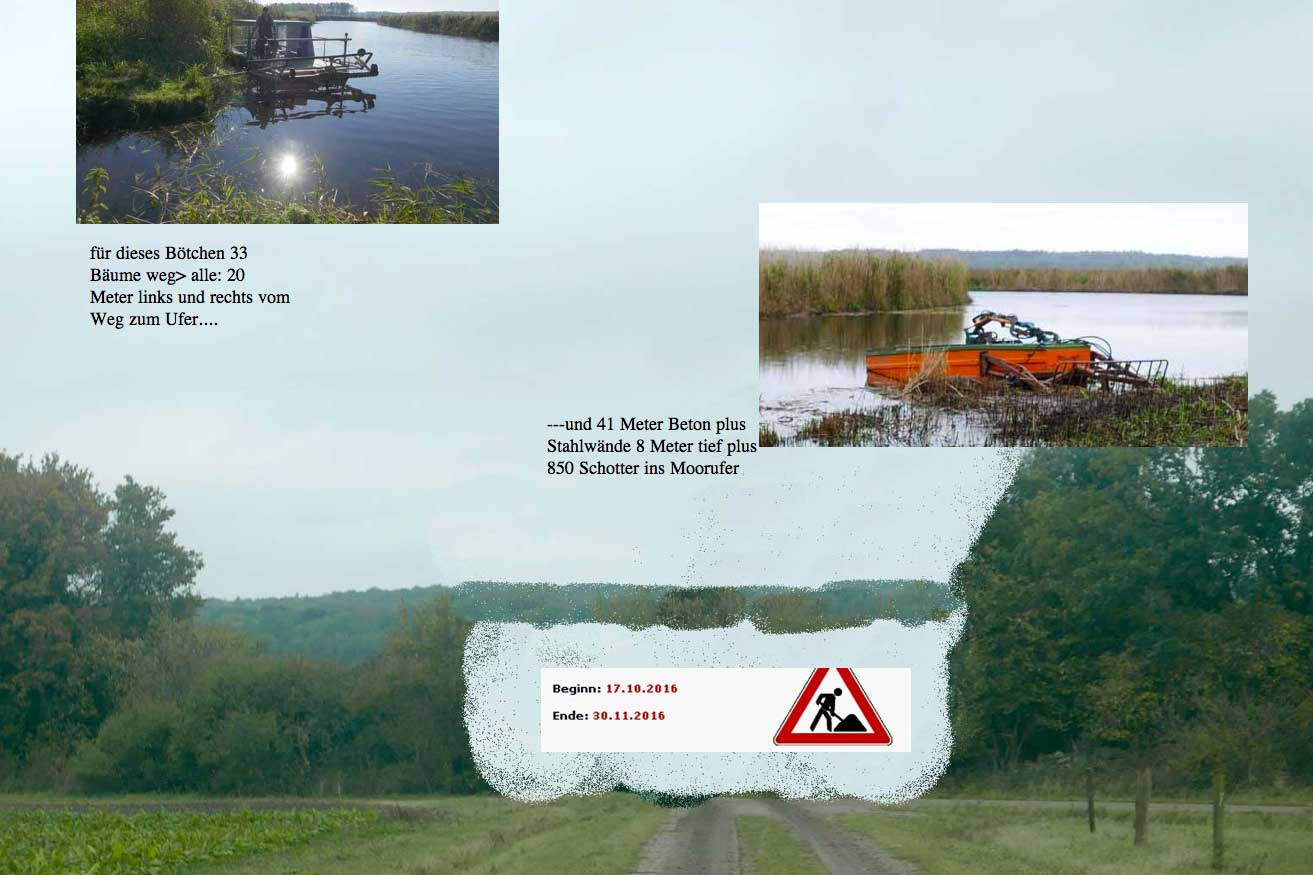Da kommt eine Armada von fremden Maschinen, rasiert alles, was überlebte einfach weg, flüllt die vertraute Natur an mit Schotter, Beton und Eisen, das Moor, die weichen Ufer, die Sträucher und Bäume, sitzt an fernen Schreibtischen und befielt, zeichnet an Apparaten , spricht von Demokratie und macht Stimmung mit laschen Auskünften, täuscht und kassieren alle, betonköpfige Arbeitsplätze des Nichts und der Selbstbestätigung dieses Hohns dessen, was wir sein können und sollen.