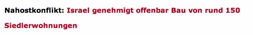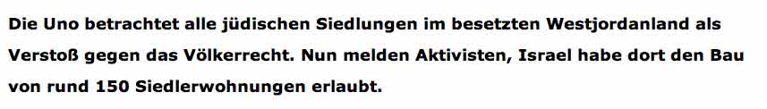 Die Regierung in Israel hat laut Aktivisten den Bau von rund 150 Siedlerwohnungen im besetzten Westjordanland offiziell genehmigt. Eine Sprecherin der siedlerkritischen Organisation "Frieden Jetzt" sagte, die Wohnungen sollten in mehreren kleinen Siedlungen in der Gegend von Ariel sowie in Carmel bei Hebron und dem Siedlungsblock Gusch Ezion errichtet werden. Laut der Organisation beendet Israel damit einen informellen 18-monatigen Baustopp in den besetzten Gebieten."Frieden Jetzt" hatte Ende Dezember erklärt, Israel plane neue Wohnungen in der besonders umstrittenen Zone E1 zwischen Jerusalem und der Siedlung Maale Adumim. Insgesamt wolle die Regierung im Westjordanland 55.548 Wohnungen bauen, darunter 8300 im Gebiet E1. Das Vorhaben, Maale Adumim an die jüdischen Siedlungen in Ostjerusalem anzubinden, gefŠhrdet eine palŠstinensische StaatsgrŸndung, weil dadurch das Westjordanland zweigeteilt würde.