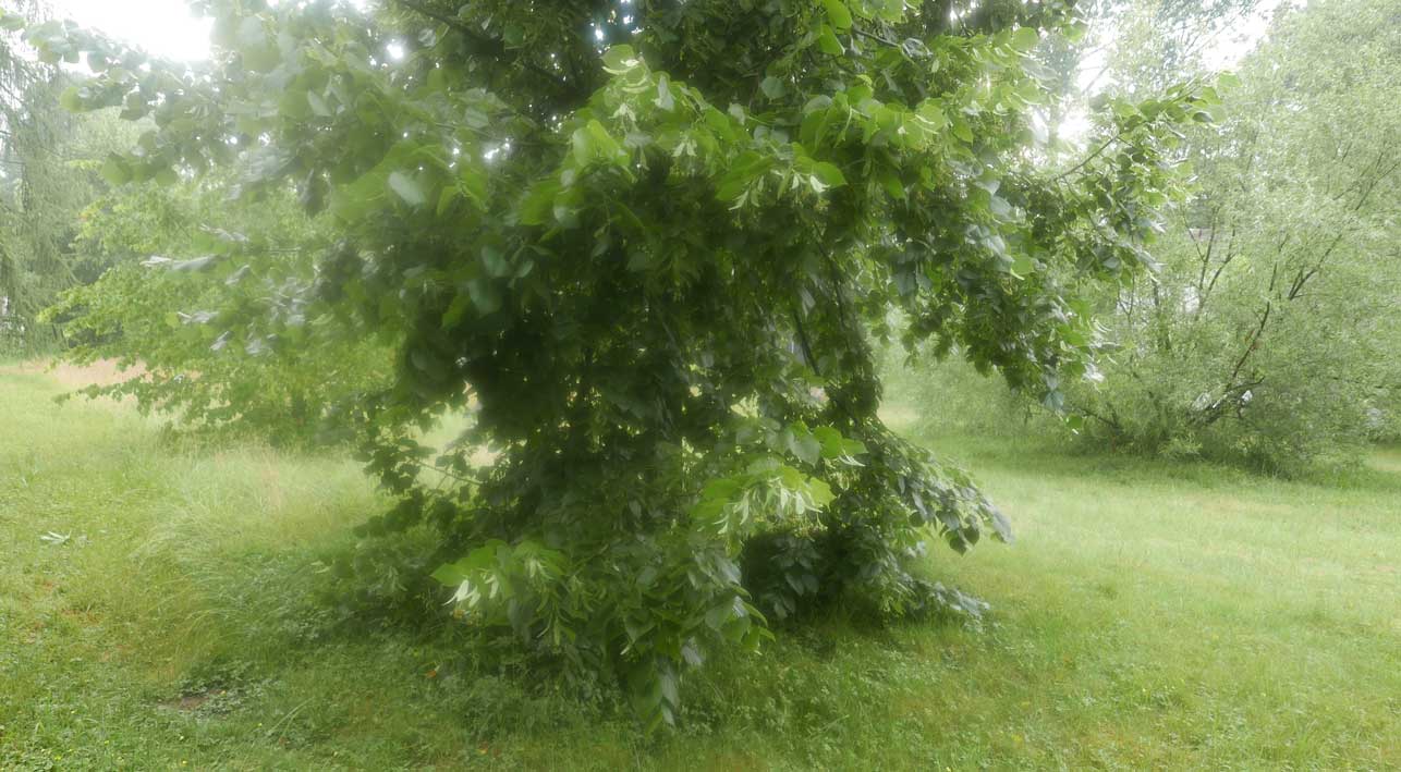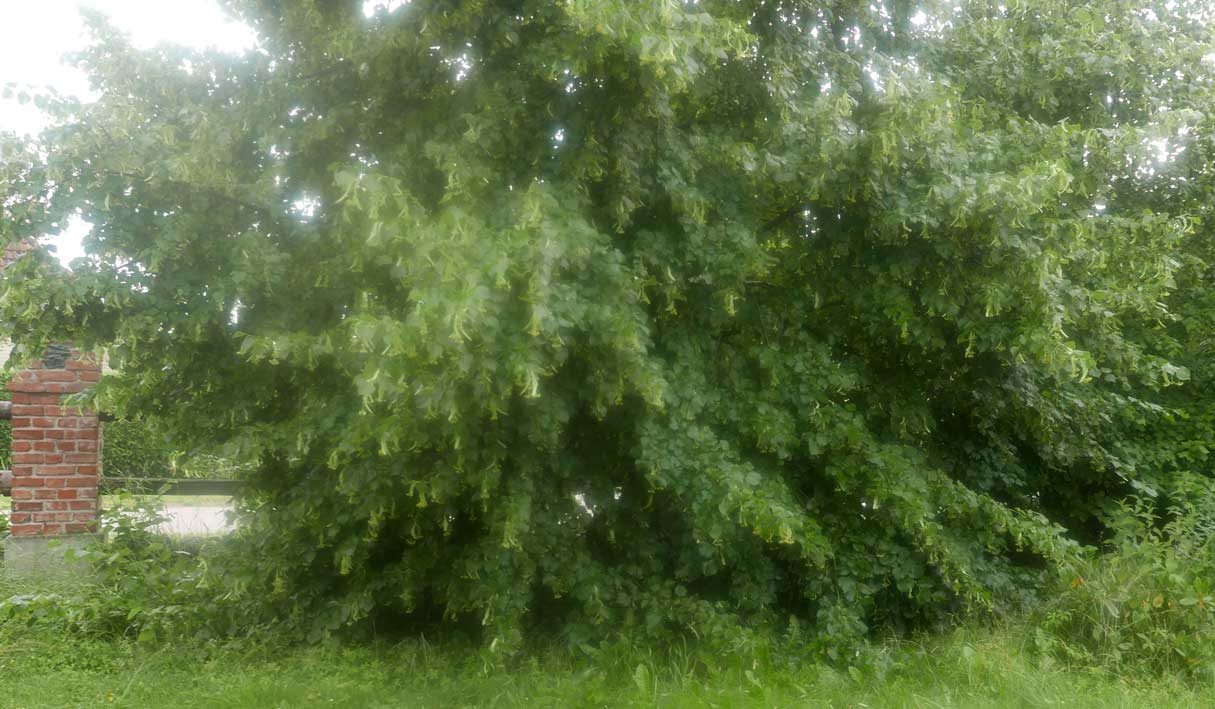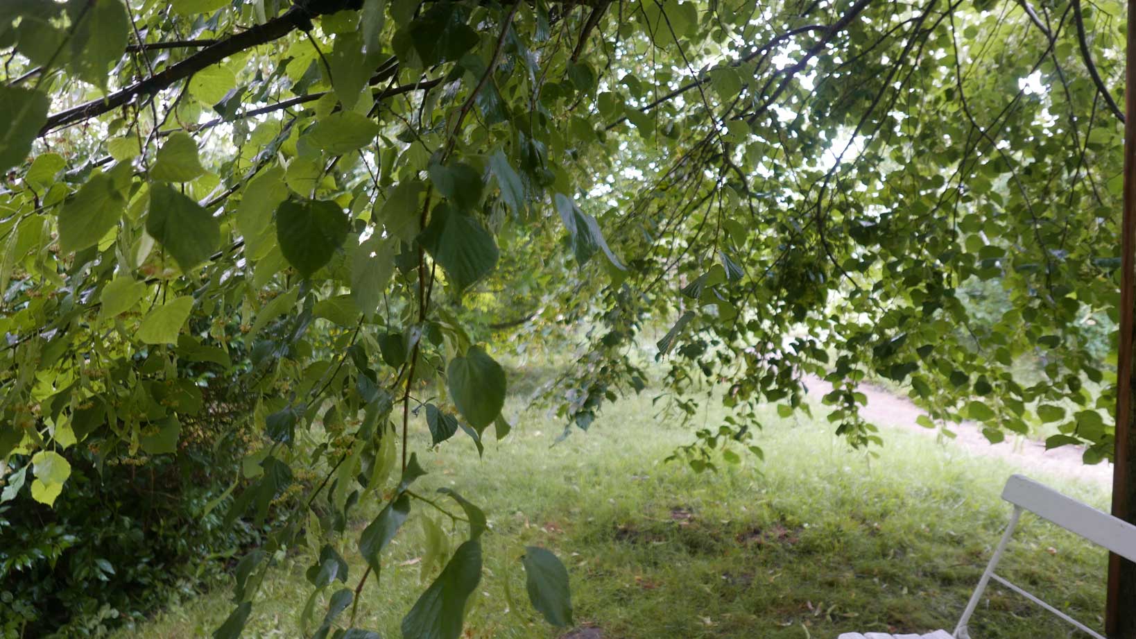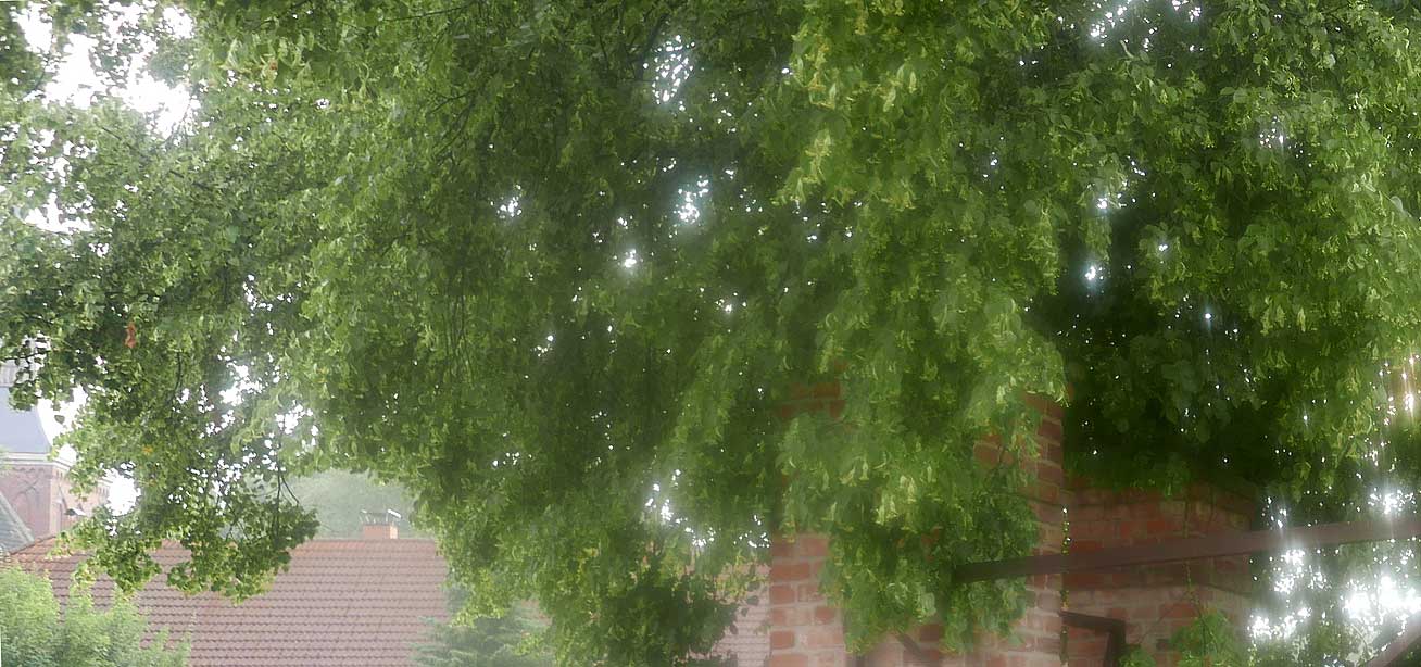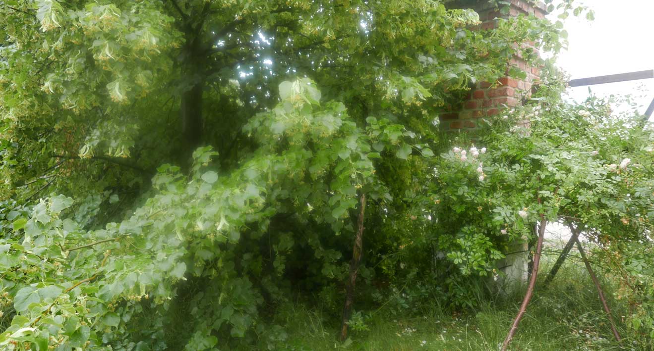 hier von diesen zwei ineinander gewachsenen Linden hinter dem Haus wie ein Gewölbe zum daruntersitzen von früher kommt es her, so zu entscheiden, in allem.