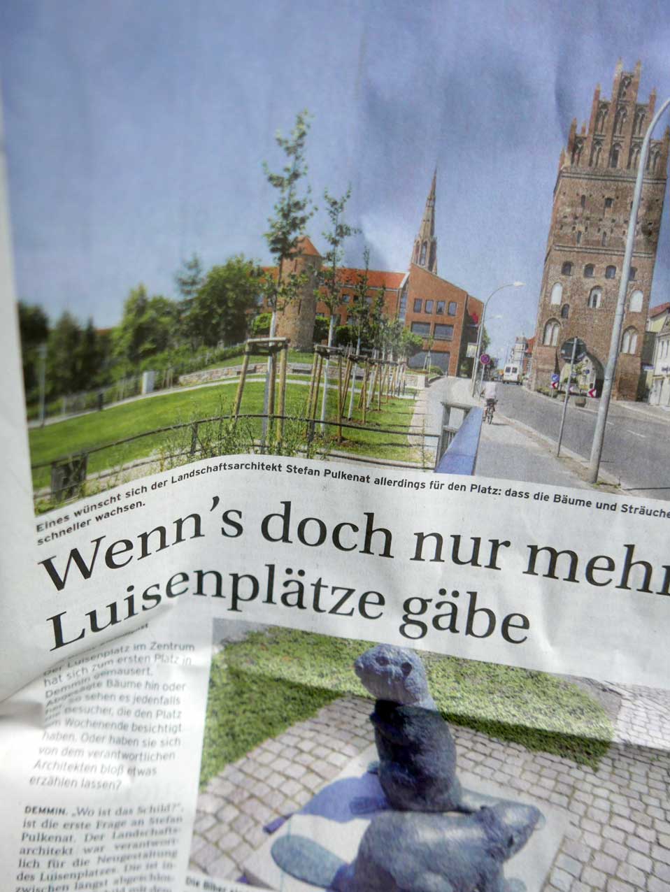 Das Luisenplatz genannte Areal ist als Beispiel der vertanen Gelegenheiten für Demmin kein letztes Beispiel. Für versäumte Geschichte. Zu teuer und Besucher-feindlich im Missbrauch der Mitte, geistig und finanziell. Leider nach missratenenem Marienhain und verlorenem Haus Demmin nicht die Endstation. Nächstes Unheil droht in der Um-Gestalt des Schwanenteichs durch den selben Verursacher. Wann wacht die Stadt auf ihr Elend zu verwandeln in die rettende allen dienende Tat, Gegenwart mit der Vergangenheit lebend zu versöhnen.