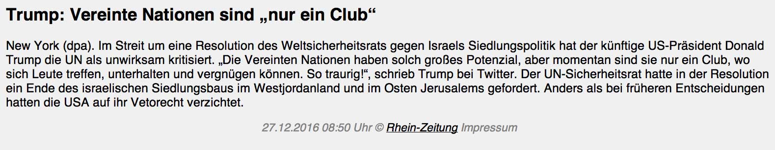 Deutschland spielt nicht mehr mit. Unfrei und ohne Position dort, wo entschieden wird und etwas entsteht. Hätten sie nun, wie immer angesrebt und legitim, einen Sitz im Sicherheitsrat, was hätten sie gestimmt: mit diesem Aussenminster für die Befreiung der Verfolgten und dieser Kanzlerin der israelischeh Staatsraison einens Netanjahu. Der Presse kann man nicht glauben. Ihre Kulturfunktionäre kriechend und ohne das, was uns einmal Achtung veschafft. Auschwitz blockert für solche jede Entwicklung. Eben noch zugespielt als Chance.