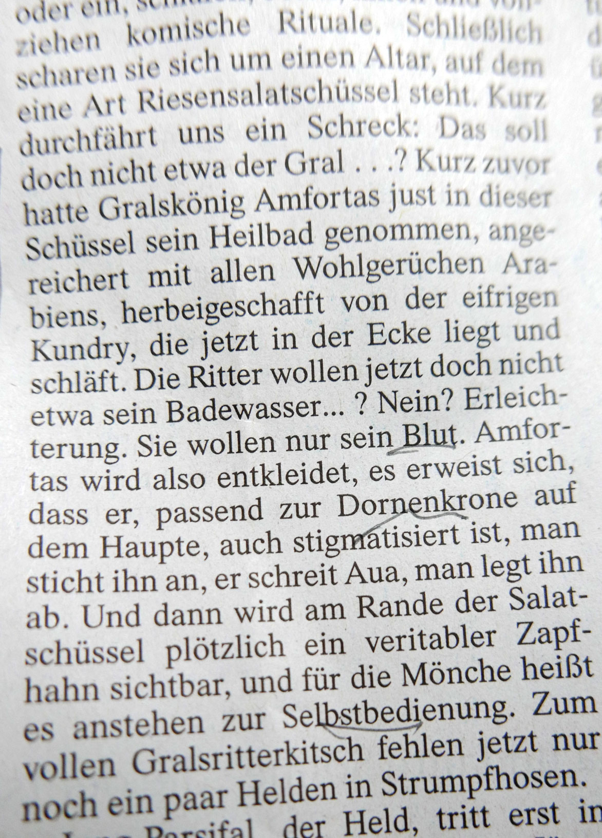 wenn dieser Amfortas sich jetzt hier die abgewiesene Kundry nochmal schnappt und neben und vor Augen des Parsifal zu dessen Worten wie bei RW gesungen, dann hat die Regie etwas zu verantworten - und das Publikum, dass nicht aufsteht, auch.