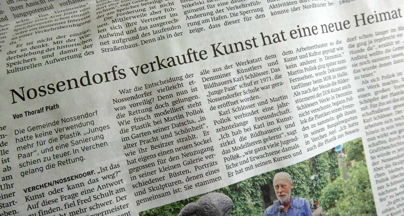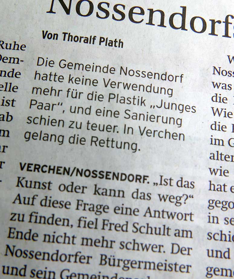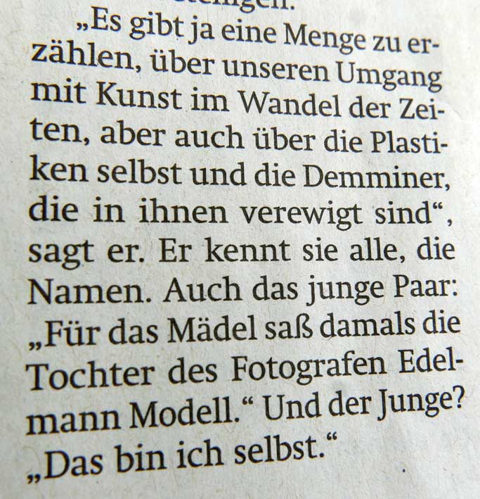 Sie hätten es nie hergeben dürfen. Das Einzige, was sie als Eigentum an Kunst aus der DDR hatten, und: eine Verschleuderung von Volkseigentum. Auf dem Markt- eine Frage an die mit Kunst Vertrauten Freunde aus N. und sie wären belehrt worden - denn diese Figurengruppe hätte den Haushalt saniert. Zumindest den nötigen Abriss der dazugeh. Schule, nun leer, finanzieren helfen. Stümper, bösartig oder nicht, justiziabel, des Gelächters sicher. Für N. schade, ein Verlust. Wie alles eins nach dem anderen verloren. Bald ist die Trebel dran.