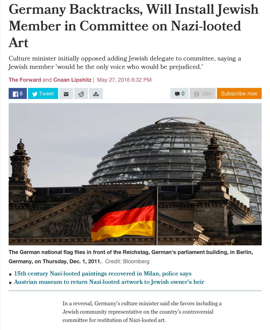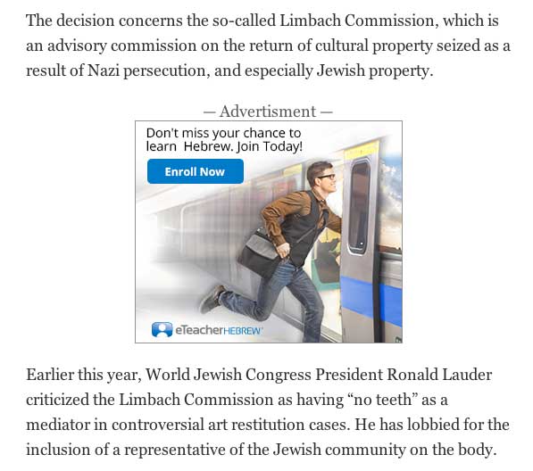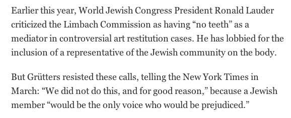 Earlier this year, World Jewish Congress President Ronald Lauder criticized the Limbach Commission as having “no teeth” as a mediator in controversial art restitution cases. He has lobbied for the inclusion of a representative of the Jewish community on the body.