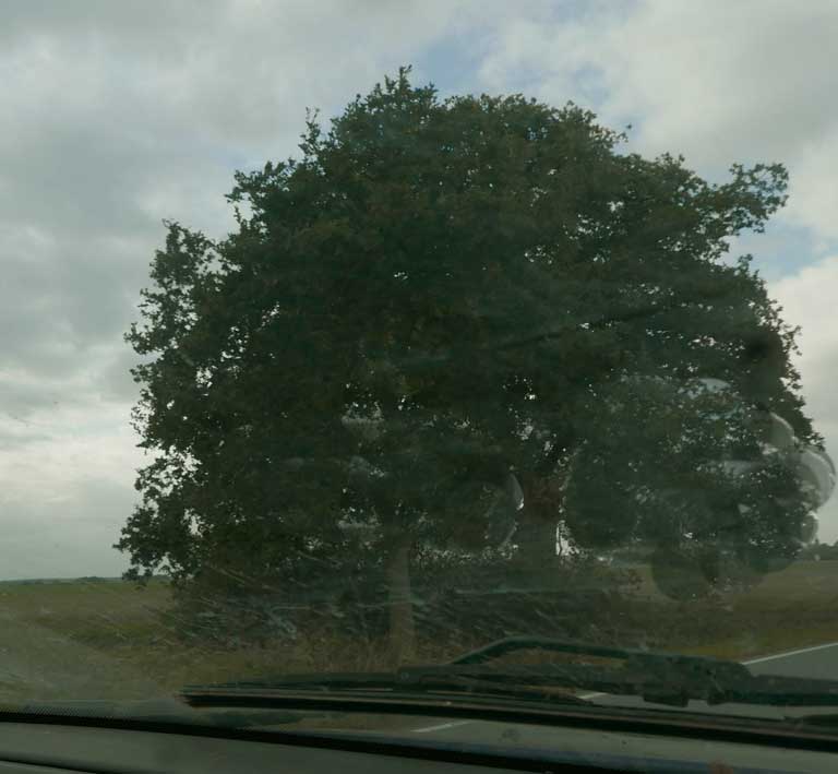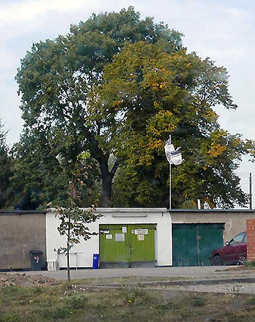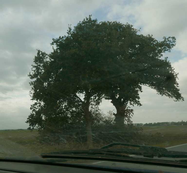 Und gleich dort an der Nossendorfer Scheide wo nach den Hecken der Turm herüber grüsst aus Demmin kommend -eben noch die schönste Eiche- nun zusammengeschnitten und ein gezäunt, zur Begrüssung das Zeichen, wo und wie sie nun sein sollen: Beschnitten und eingezäunt, entstellte Natur.