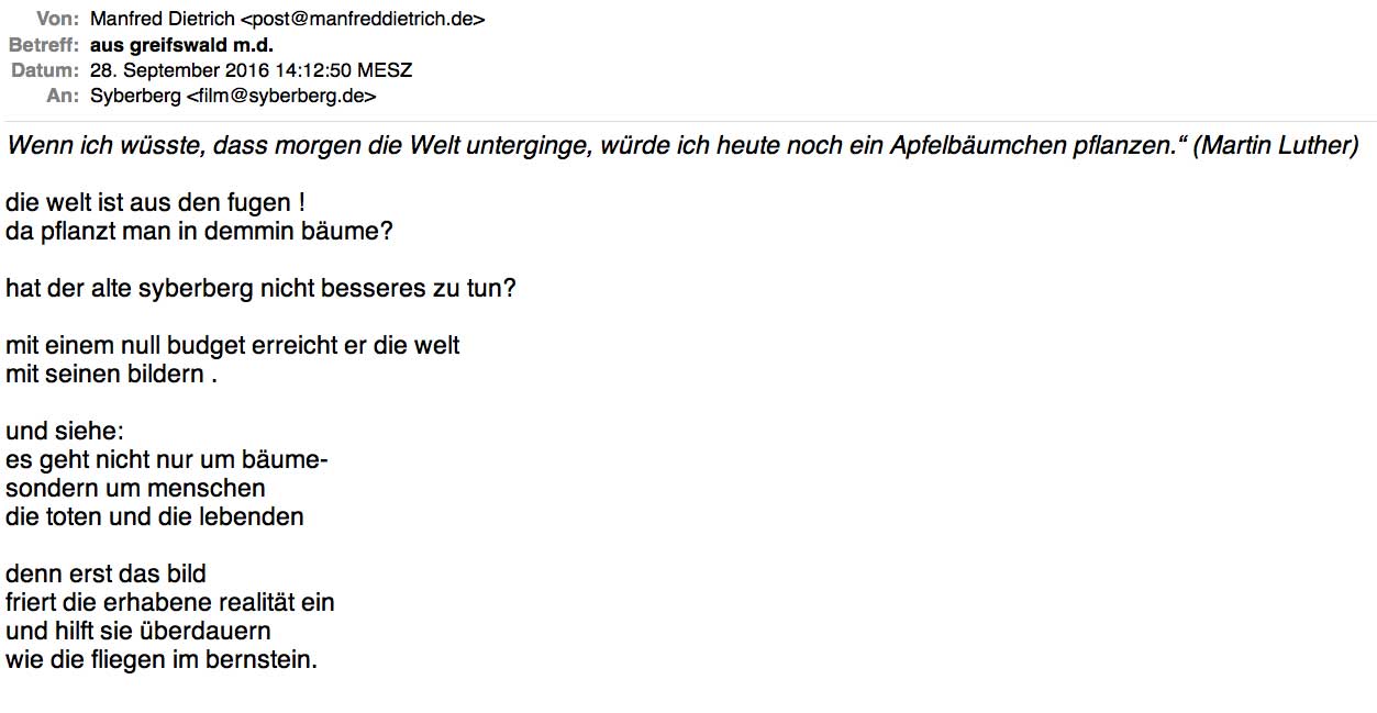 und ein anderer kommt das Geld zu bringen für einen Baum mit seinem Namen aus Demmin, sich bedankend "für das Engagement"